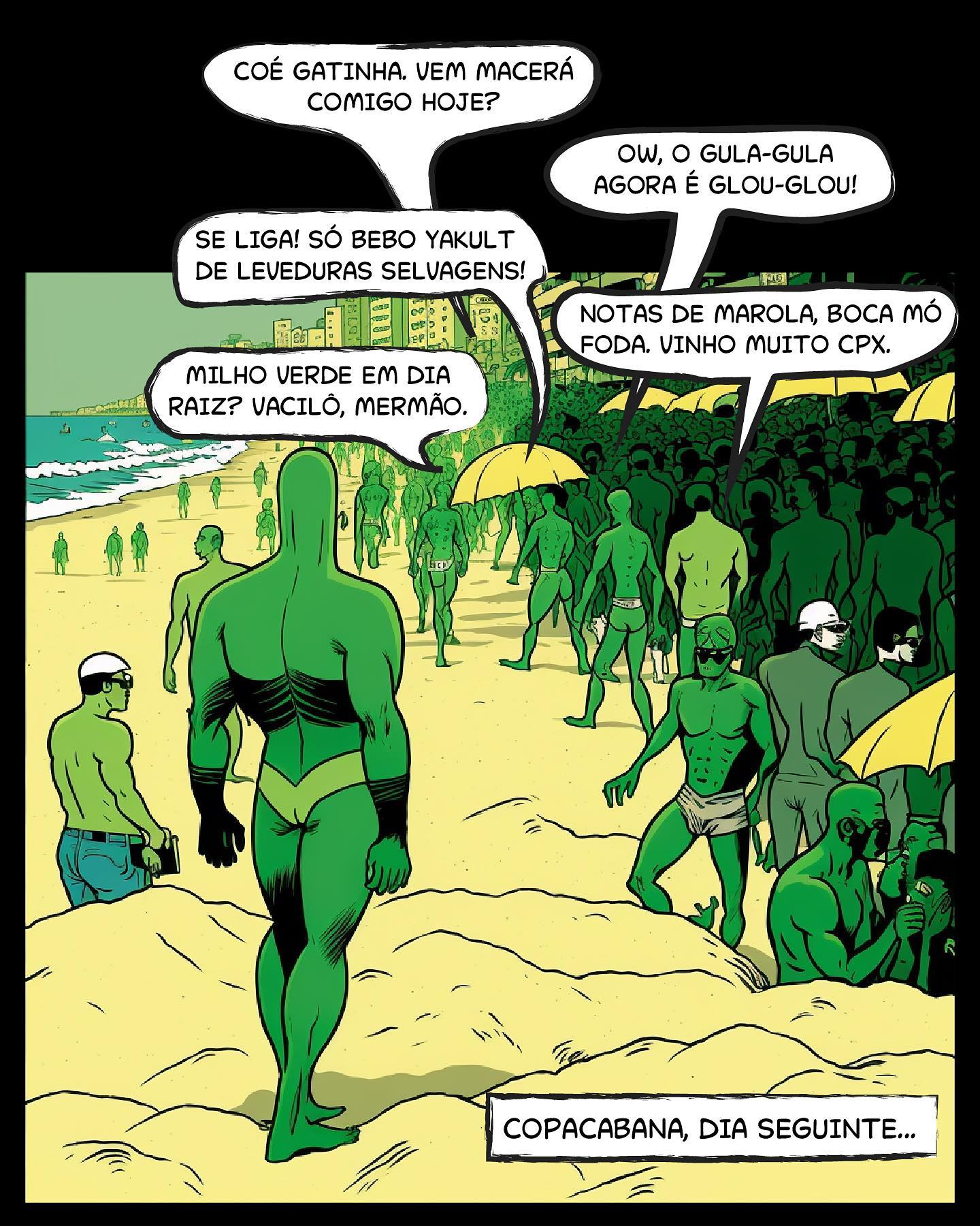Painel 10 Praia de Copacabana lotada de pessoas com pele verde (mutantes/zumbis do vinho natural). Caixa de Texto: COPACABANA, DIA SEGUINTE... Balão 1: "COÉ GATINHA, VEM MACERÁ COMIGO HOJE?" Balão 2: "SE LIGA! SÓ BEBO YAKULT DE LEVEDURAS SELVAGENS!" Balão 3: "OW, O GULA-GULA AGORA É GLOU-GLOU!" Balão 4: "NOTAS DE MAROLA, BOCA MÓ FODA. VINHO MUITO CPX." Balão 5: "MILHO VERDE EM DIA RAIZ? VACILÔ, MERMÃO."