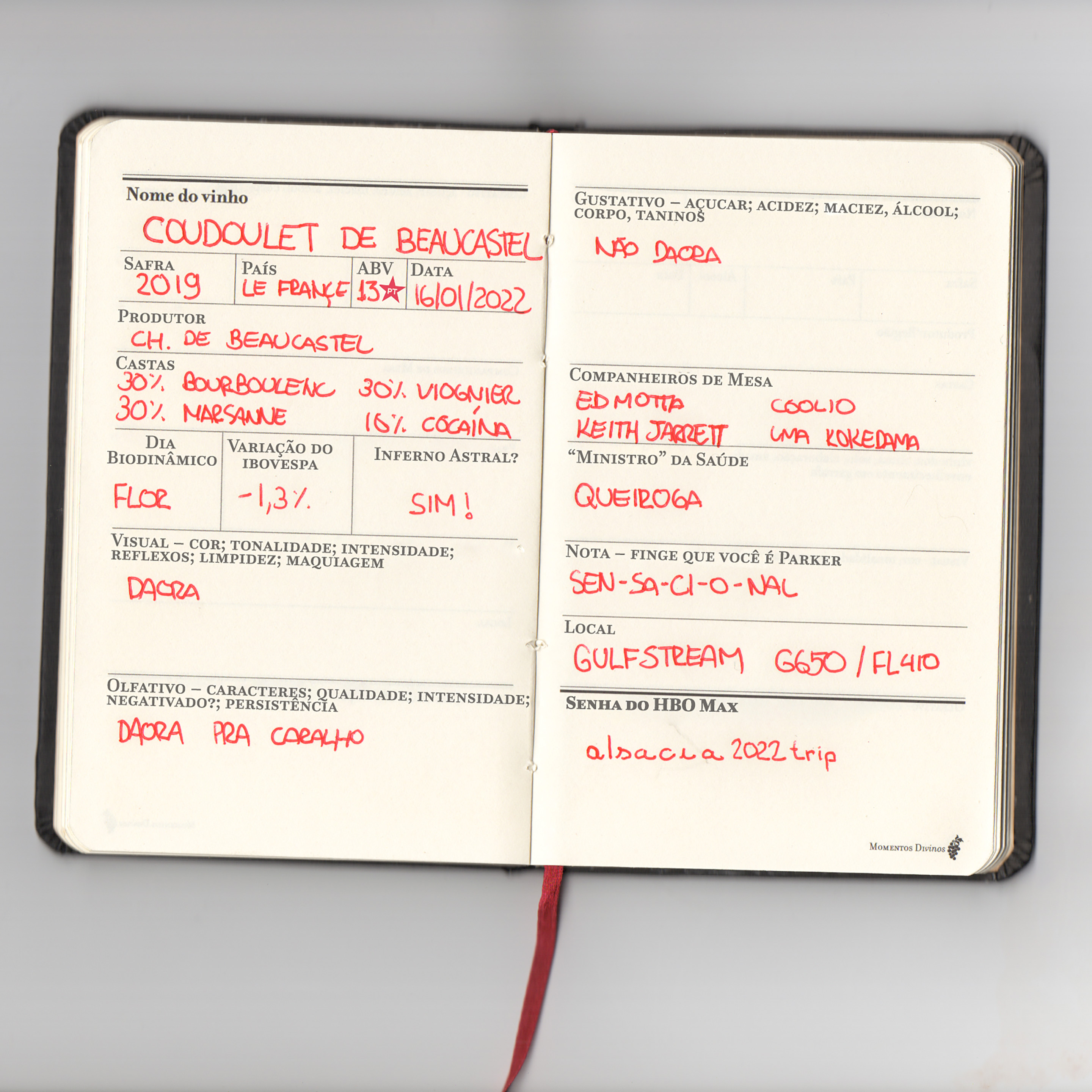 Um caderno de bolso para tomar notas de degustação de vinhos, com os campos preenchidos assim: