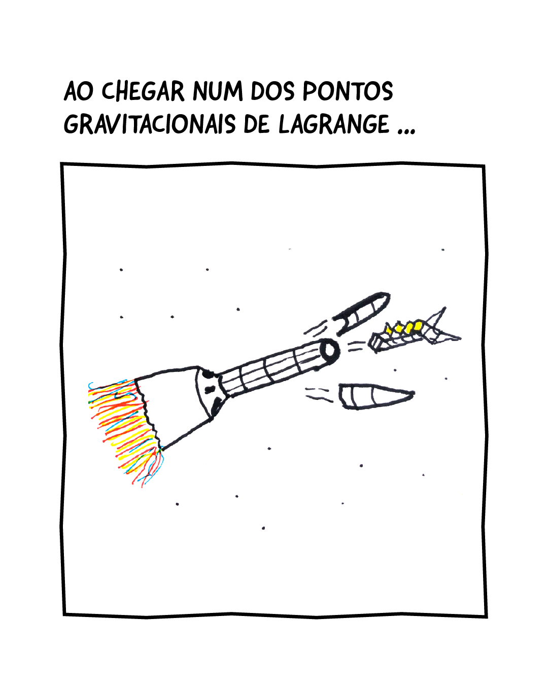 | ... E VIAJOU UM MILHÃO DE QUILÔMETROS. | Foguete saindo da atmosfera da Terra, dizendo VAMO NENÊ! |
