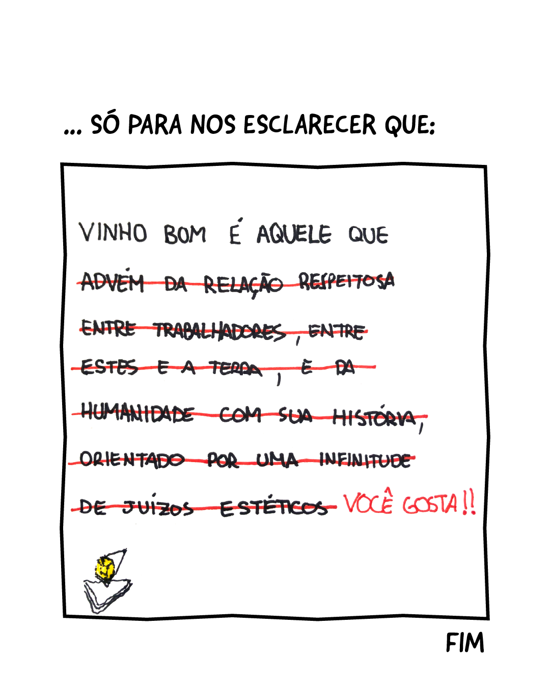 O tema geral é a dicotomia simplicidade X complexidade, ignorância X conhecimento. A frase Vinho bom é aquele que você gosta! é usada para justificar nossas escolhas, reduzindo o valor da bebida à uma questão da estética do gosto. Contrapõe-se as ideais de que o vinho é uma construção social, a partir da relação entre homem e natureza, e que a avaliação da bebida deve considerar estas questões. Vinho não pode ser avaliado como bom ou ruim somente pelo olfato e sabor.