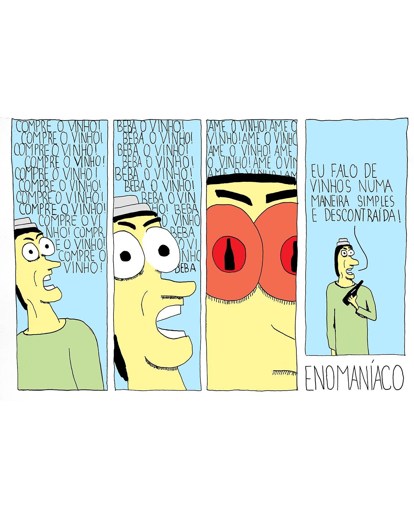 Painel 1: Um homem de chapéu e camiseta verde olha para o lado, com a boca aberta. O fundo está preenchido repetidamente com a frase "COMPRE O VINHO!". Painel 2: O rosto do homem em close-up, parecendo alucinado. O fundo diz repetidamente "BEBA O VINHO!". Painel 3: Close extremo nos olhos do homem, que agora são grandes bolas vermelhas com pupilas em fenda (como um réptil ou em transe). O fundo diz "AME O VINHO!". Painel 4: O homem é visto de corpo inteiro, segurando uma garrafa de vinho preta pelo gargalo e com um cigarro na boca. Ele diz: "EU FALO DE VINHOS NUMA MANEIRA SIMPLES E DESCONTRAÍDA!". Rodapé: A palavra "ENOMANÍACO" escrita à mão.