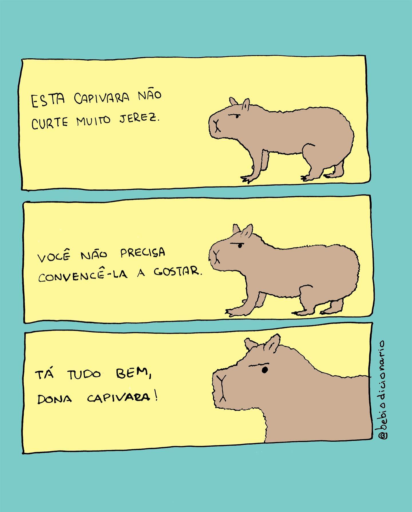 1. Uma capivara olha desconfiada para a esquerda. Texto: "ESTA CAPIVARA NÃO CURTE MUITO JEREZ."