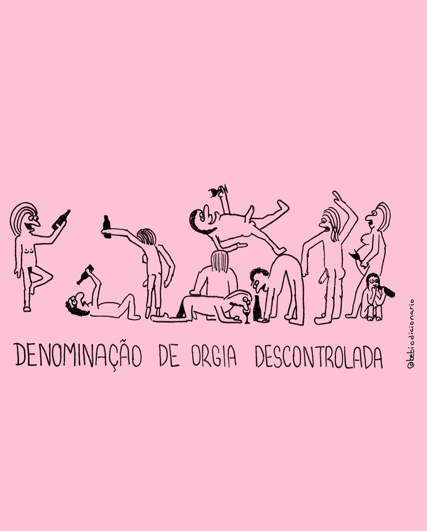 Abaixo da ilustração, em letras de forma pretas e irregulares (estilo manuscrito), lê-se a legenda interna: "DENOMINAÇÃO DE ORGIA DESCONTROLADA". Na lateral direita, lê-se a assinatura vertical "@bebiodicionario".