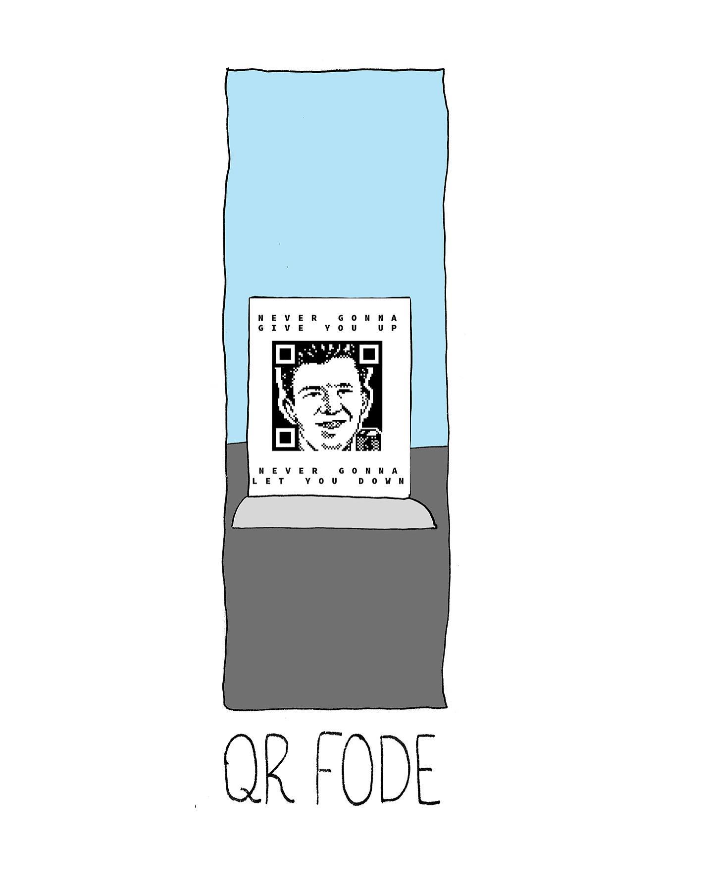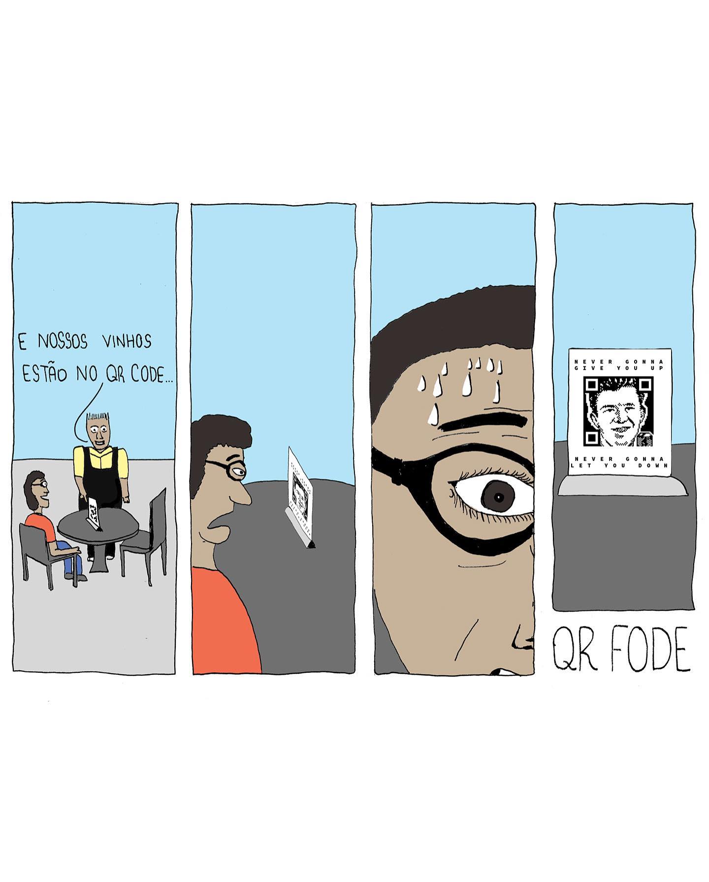 Abaixo da imagem, em letras grandes, está o trocadilho final da tira: "QR FODE".
