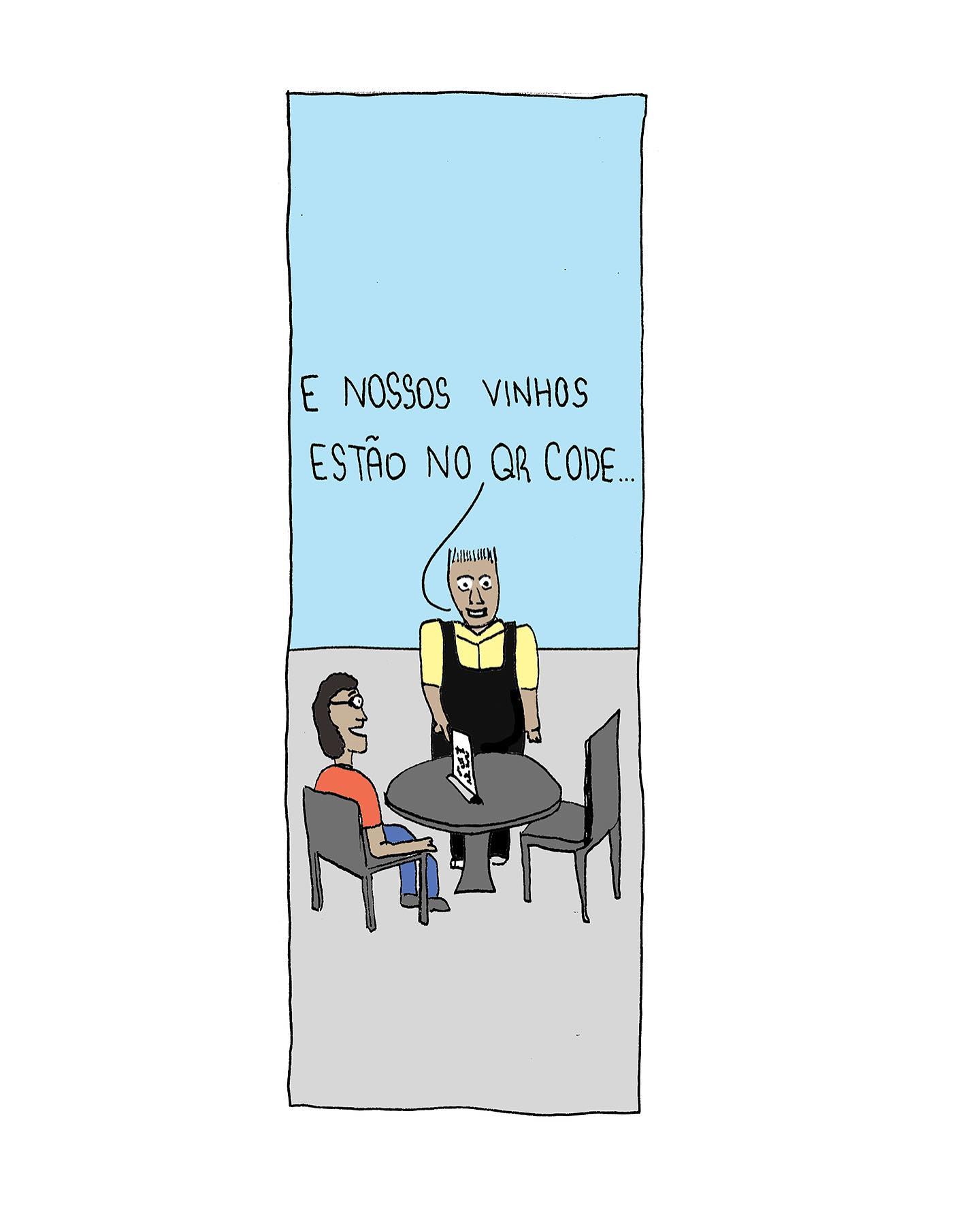 • Primeiro quadro: Um garçom de camisa amarela e avental preto está em pé ao lado de uma mesa, falando com um cliente sentado que usa óculos e camisa vermelha. Sobre a mesa, há um pequeno display de acrílico. O garçom aponta para o display e diz: "E NOSSOS VINHOS ESTÃO NO QR CODE...".