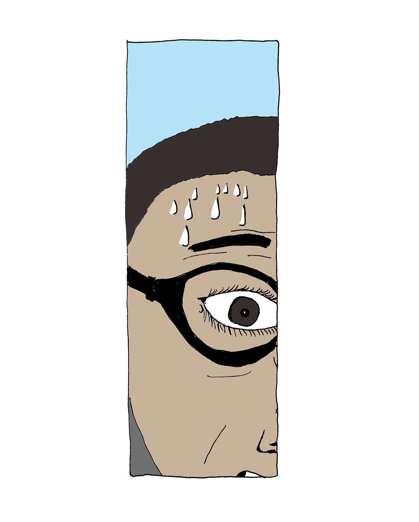 • Terceiro quadro: Um close-up extremo no rosto do cliente. Ele está suando frio (gotas de suor na testa) e com o olho arregalado, demonstrando pânico ou choque.