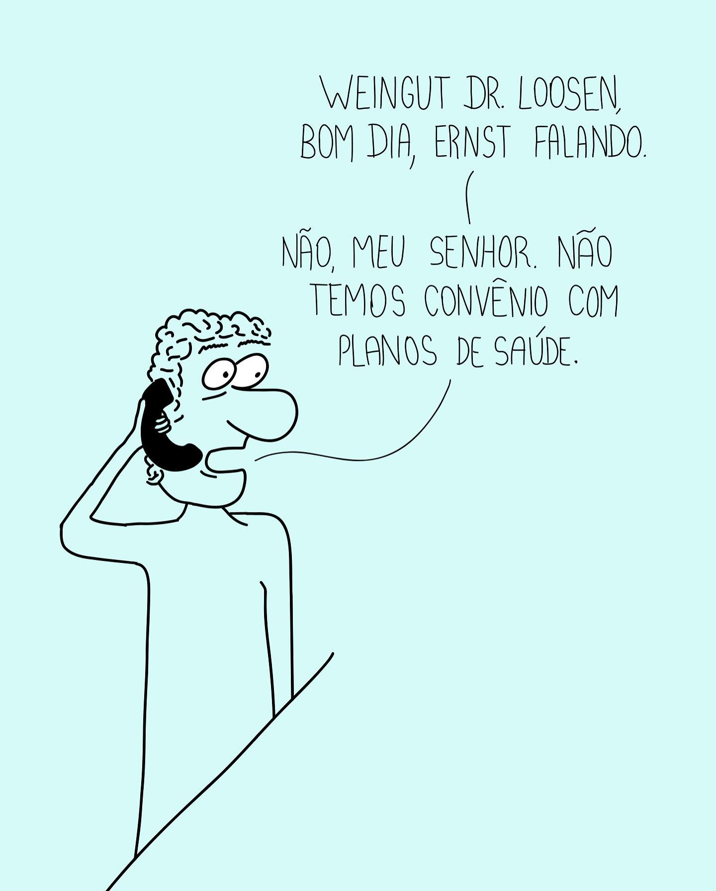 Fala do personagem: "WEINGUT DR. LOOSEN, BOM DIA, ERNST FALANDO. ... NÃO, MEU SENHOR. NÃO TEMOS CONVÊNIO COM PLANOS DE SAÚDE."