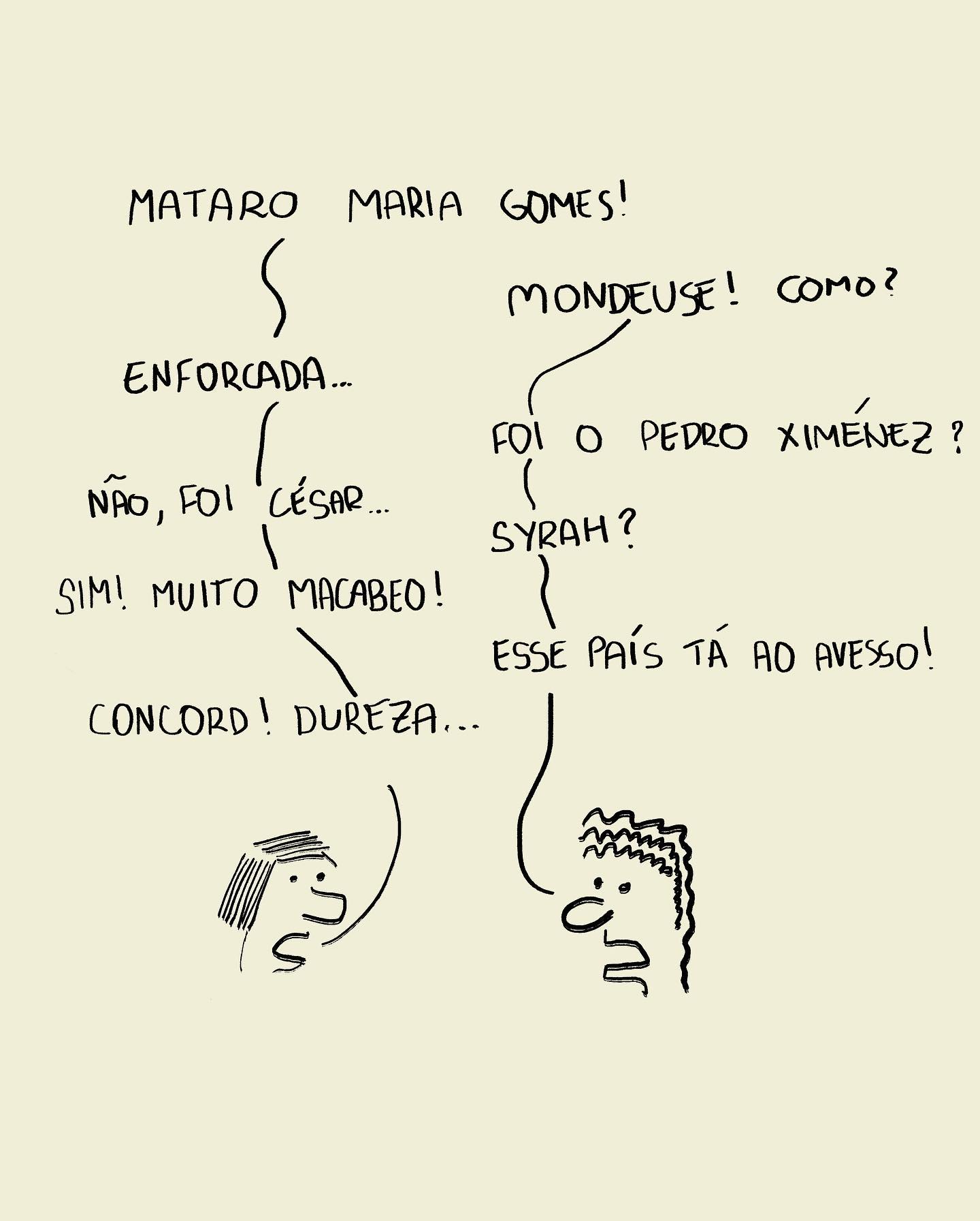 — "MATARO MARIA GOMES!" — "MONDEUSE! COMO?" — "ENFORCADA..." — "FOI O PEDRO XIMÉNEZ?" — "NÃO, FOI CÉSAR..." — "SYRAH?" — "SIM! MUITO MACABEO!" — "CONCORD! DUREZA..." — "ESSE PAÍS TÁ AO AVESSO!"