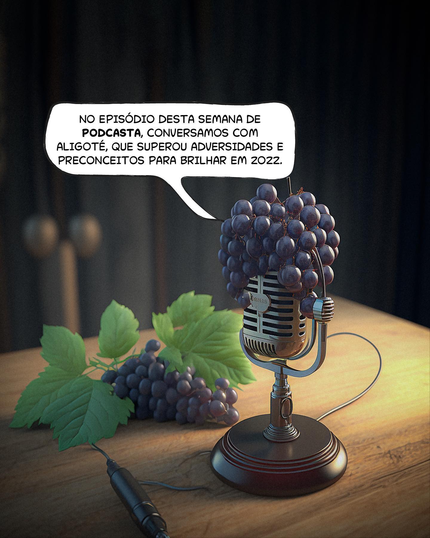 Podcasta: O termo é uma fusão de "Podcast" com "Casta" (nomenclatura utilizada para designar a variedade da uva, como Cabernet Sauvignon, Merlot, etc.). A imagem ilustra isso literalmente, transformando a "casta" (as uvas) no interlocutor do programa.