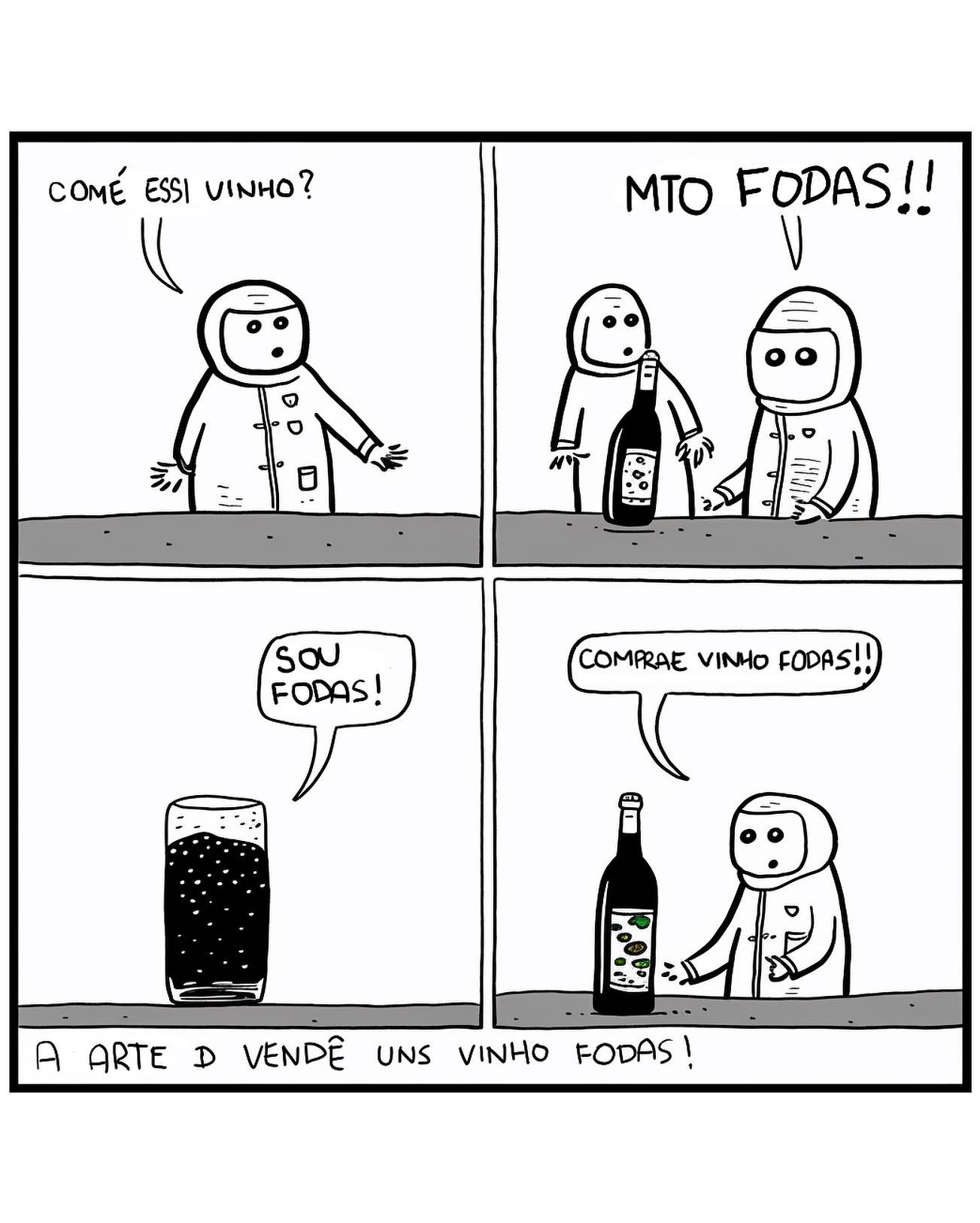 - A Crítica: O cartum ironiza a superficialidade das vendas. O consumidor não quer saber de terroir, casta ou safra; ele quer apenas a validação social de estar comprando algo "fodas". A simplicidade do diálogo ("Como é?" / "Muito fodas" / "Comprae") reflete a falta de profundidade nas interações comerciais modernas.