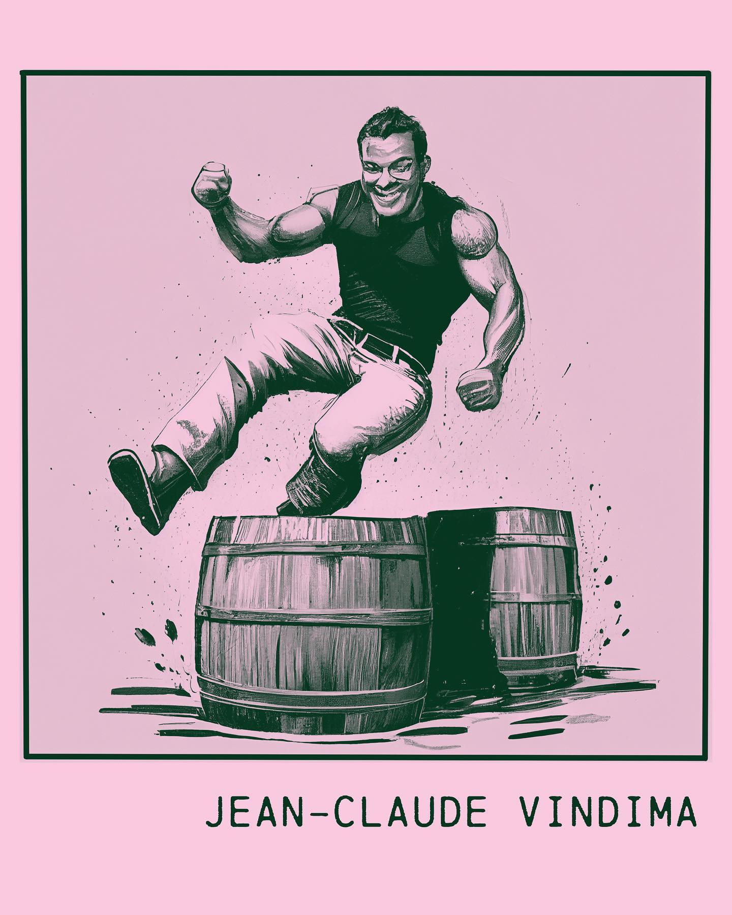 A imagem é uma ilustração em duotônico (rosa e preto) mostrando o ator e artista marcial Jean-Claude Van Damme. Ele está executando um de seus saltos característicos com as pernas abertas, pulando sobre duas barricas de carvalho.