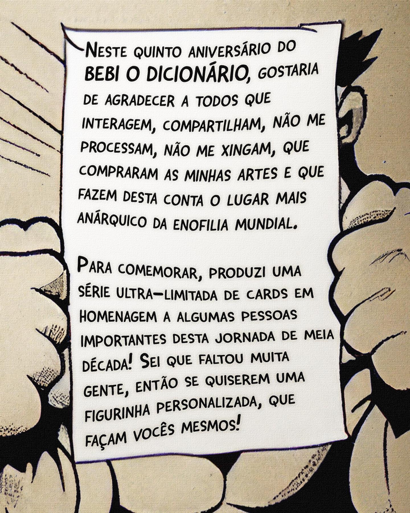 Esta é a primeira parte de uma trilogia de posts comemorativos celebrando os 5 anos do perfil "Bebi o Dicionário". As imagens são cards colecionáveis fictícios que homenageiam amigos, parceiros, inspirações e personagens recorrentes da "enofilia anárquica" promovida pela conta.