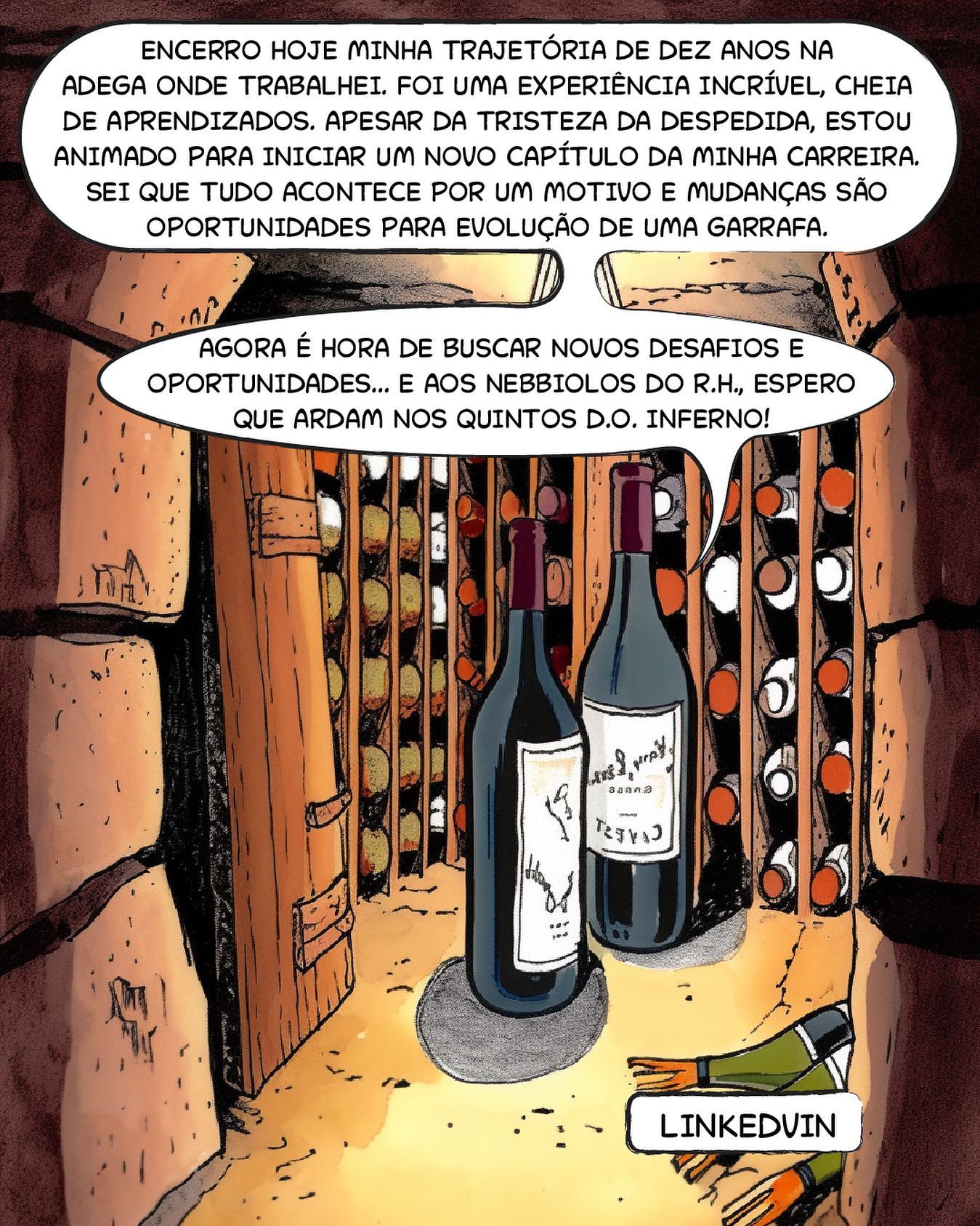 Balão 1: "ENCERRO HOJE MINHA TRAJETÓRIA DE DEZ ANOS NA ADEGA ONDE TRABALHEI. FOI UMA EXPERIÊNCIA INCRÍVEL, CHEIA DE APRENDIZADOS. APESAR DA TRISTEZA DA DESPEDIDA, ESTOU ANIMADO PARA INICIAR UM NOVO CAPÍTULO DA MINHA CARREIRA. SEI QUE TUDO ACONTECE POR UM MOTIVO E MUDANÇAS SÃO OPORTUNIDADES PARA EVOLUÇÃO DE UMA GARRAFA."