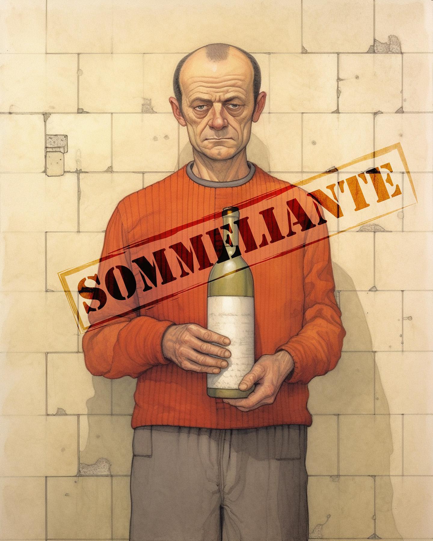 A imagem é uma ilustração digital, mostrando um homem de meia-idade, calvo, com expressão séria e cansada, vestindo um suéter laranja (que remete a uniformes de presidiários americanos). Ele segura uma garrafa de vinho contra o peito, como se fosse uma plaqueta de identificação policial (mugshot).