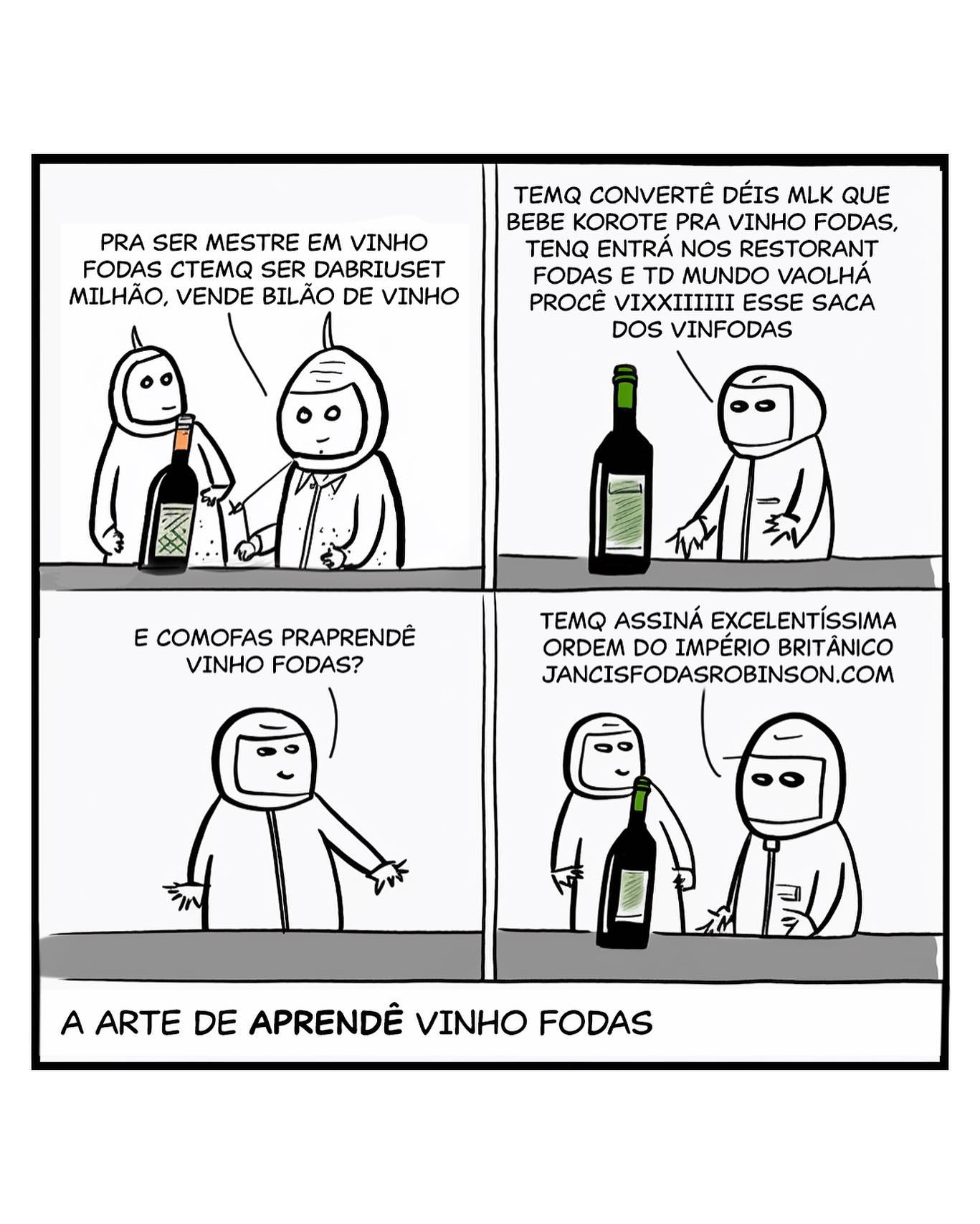Esta tira satiriza a educação formal em vinhos e a idolatria a figuras de autoridade, contrastando a linguagem "truncada/internetês" (escrita aglutinada e cheia de gírias como "ctemq", "comofas") com as instituições mais prestigiadas do mundo do vinho.
