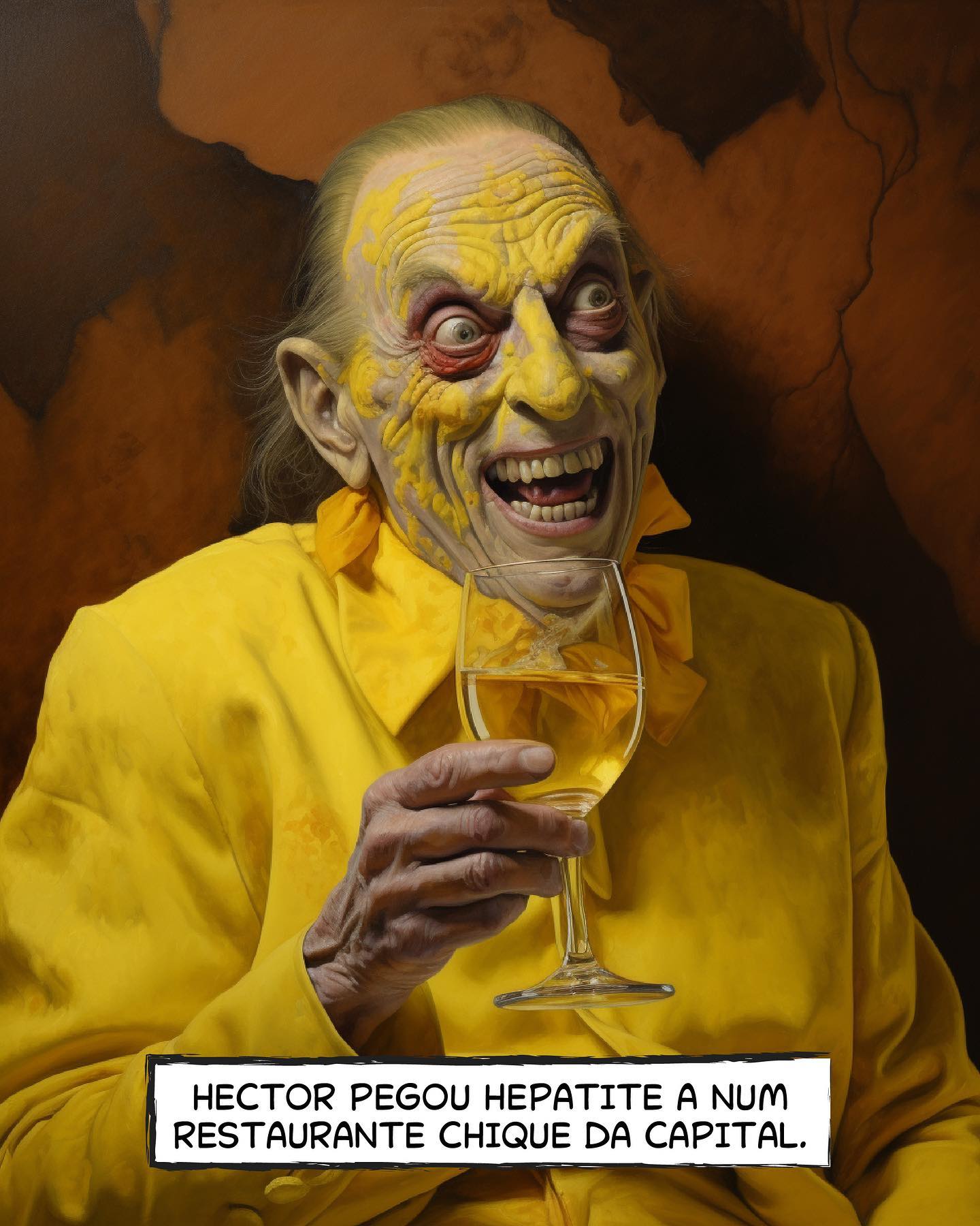 - HECTOR: Homem com pele amarelada e expressão maníaca segurando vinho branco.