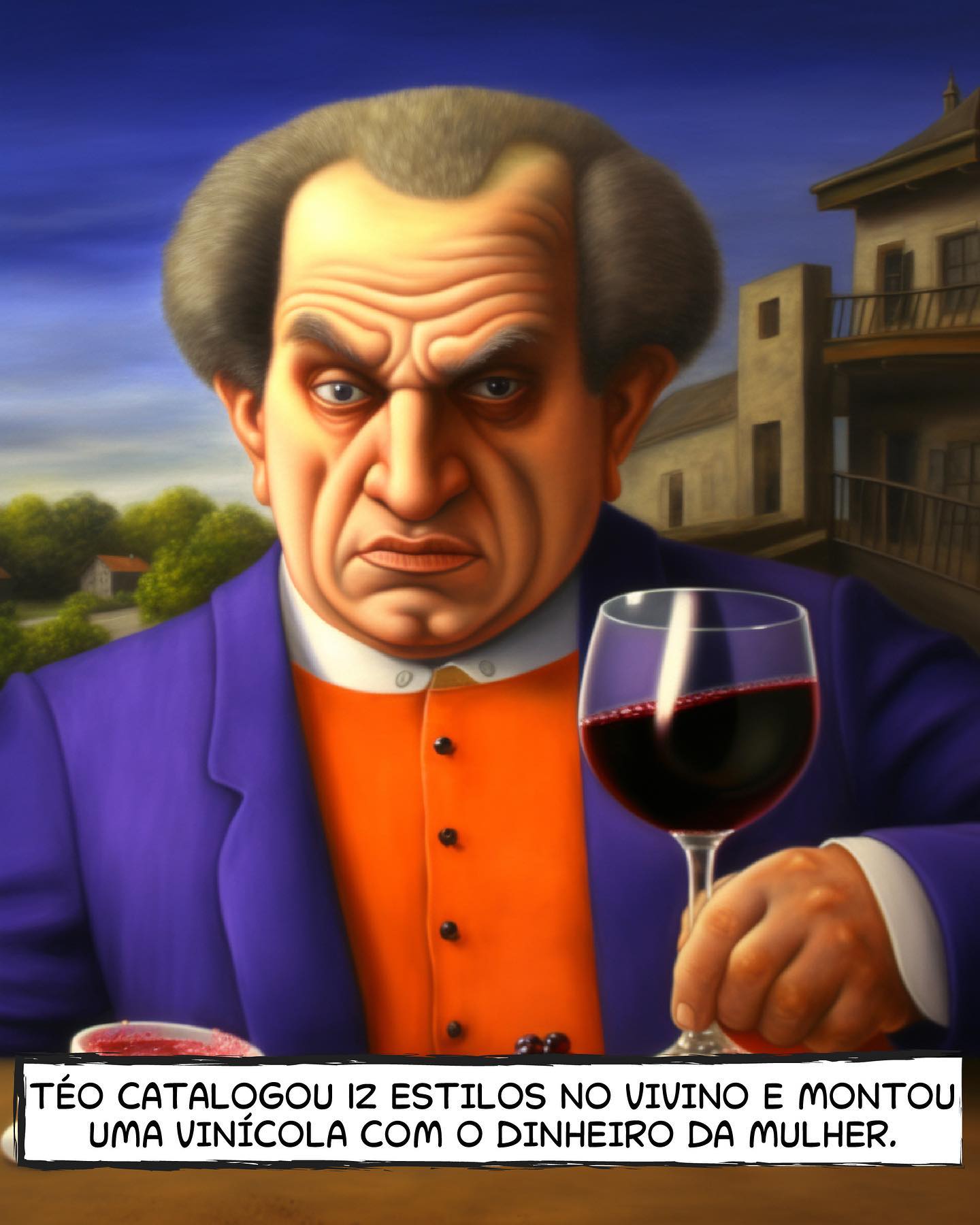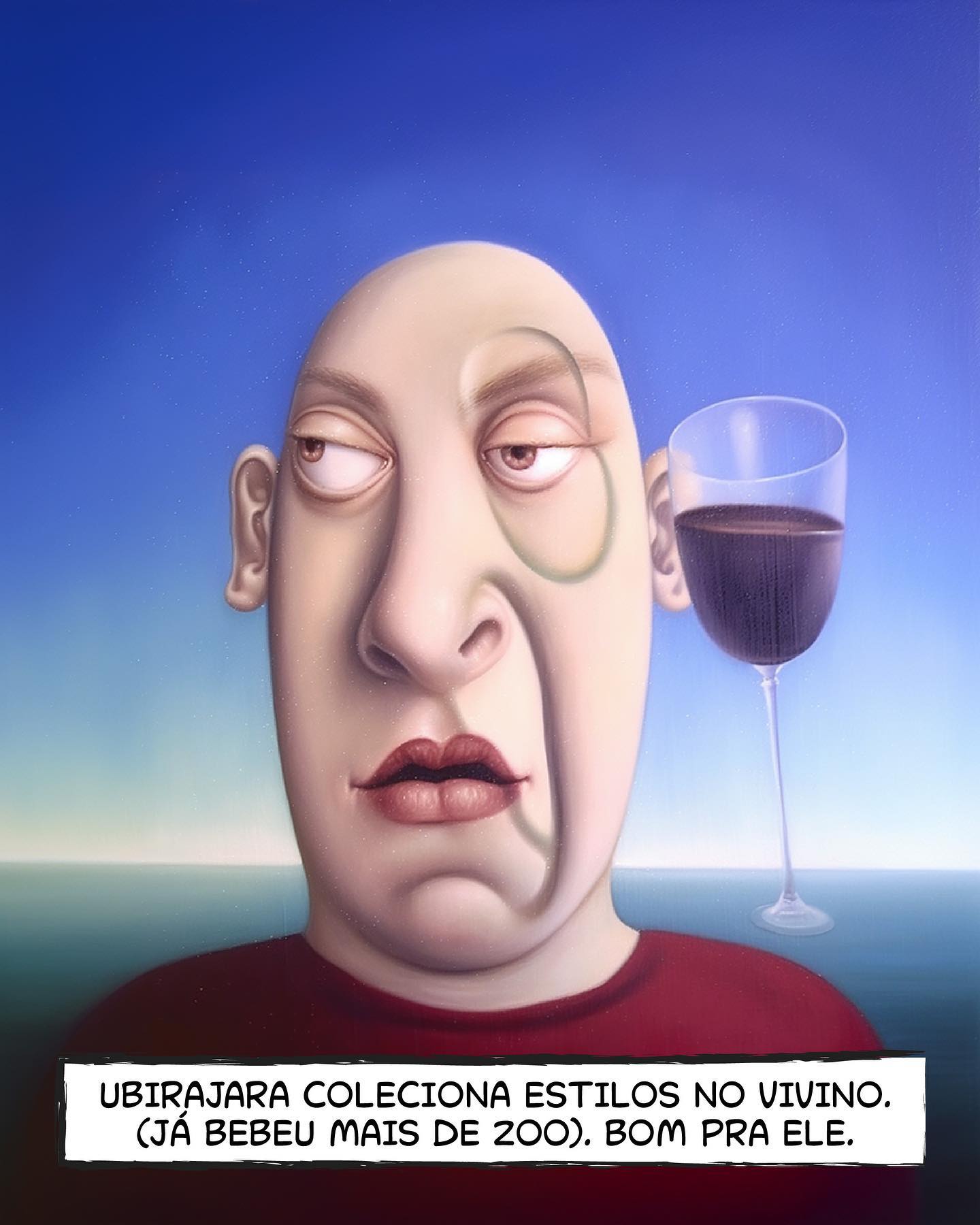 - UBIRAJARA: Homem careca com monóculo distorcido e taça de vinho ao lado da orelha.
