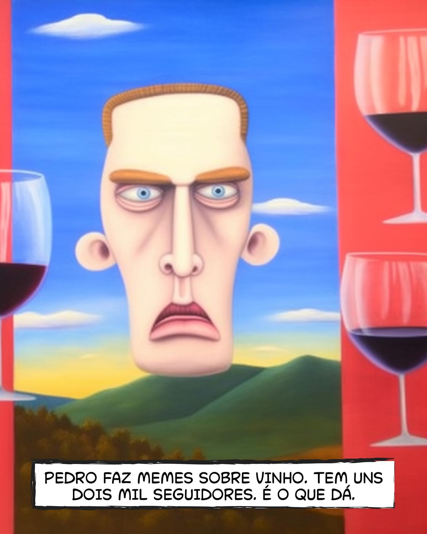 - "Pedro faz memes sobre vinho. Tem uns dois mil seguidores. É o que dá."