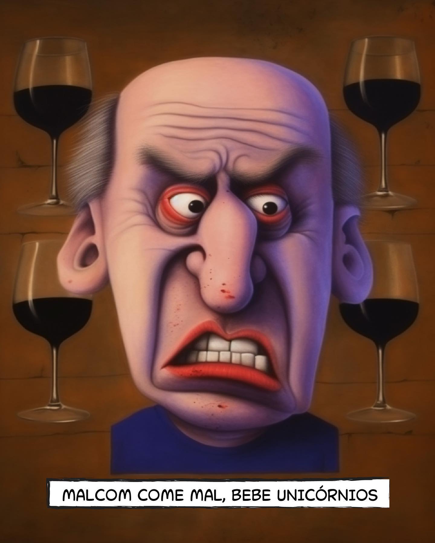 - MALCOM: Rosto roxo e irritado, cercado por quatro taças de vinho tinto.