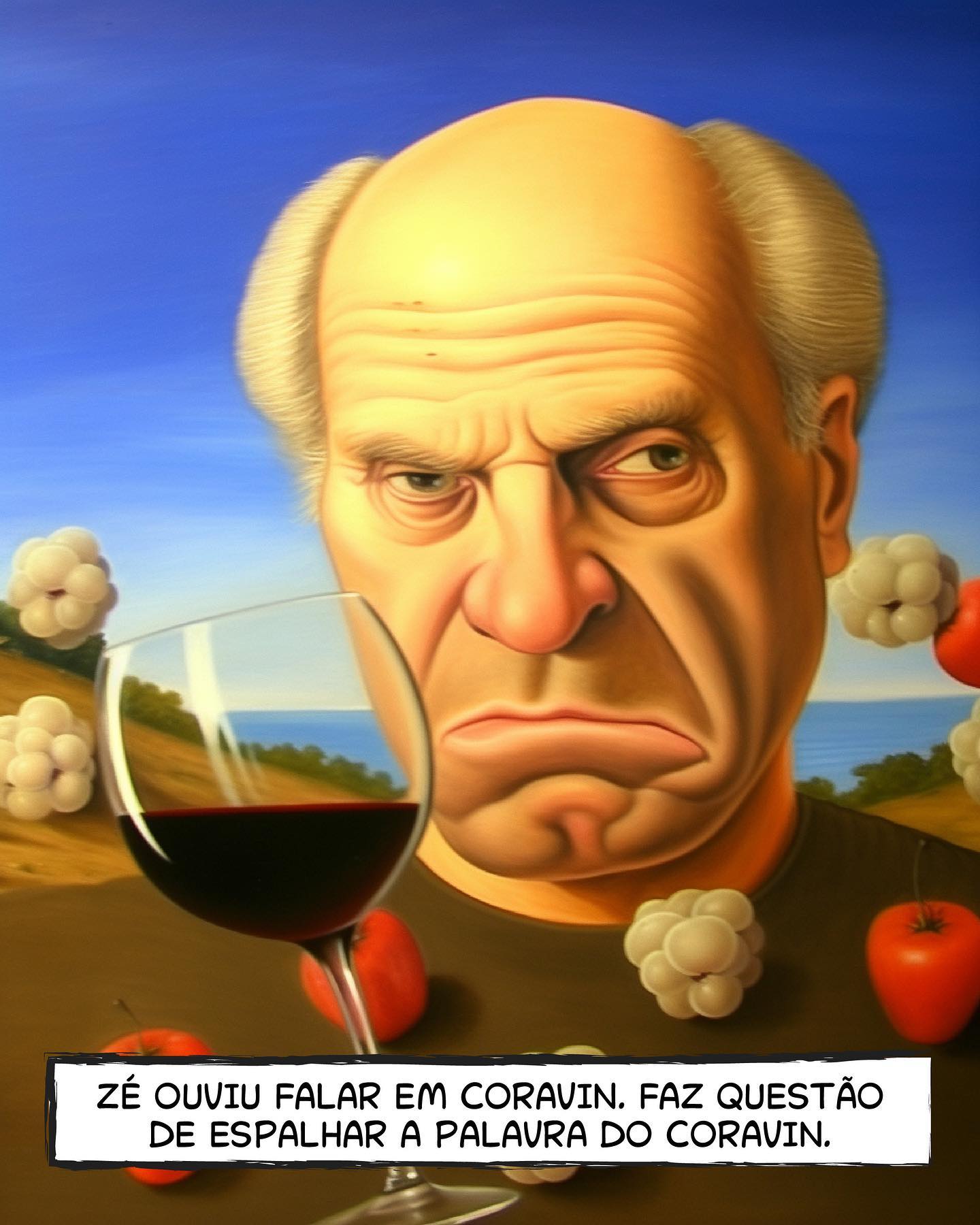 - ZÉ: Homem com expressão cética segurando uma taça, cercado por nuvens de algodão (?) e tomates.