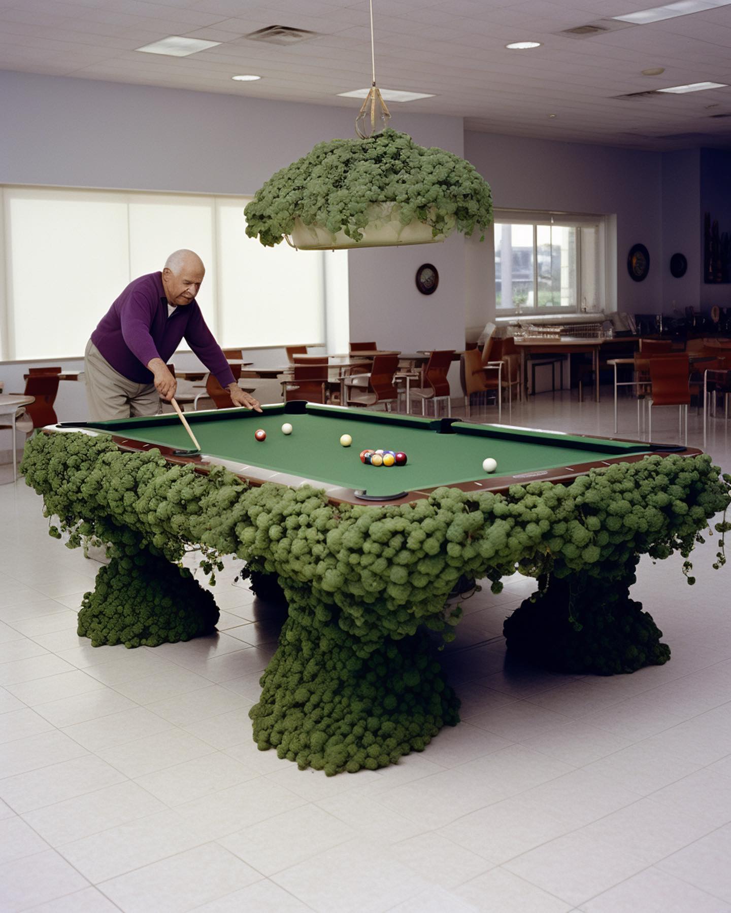 6. Snooker: Uma mesa de bilhar onde toda a lateral e as pernas são feitas de vegetação densa (como se fossem uvas ou arbustos aparados). Um senhor joga.