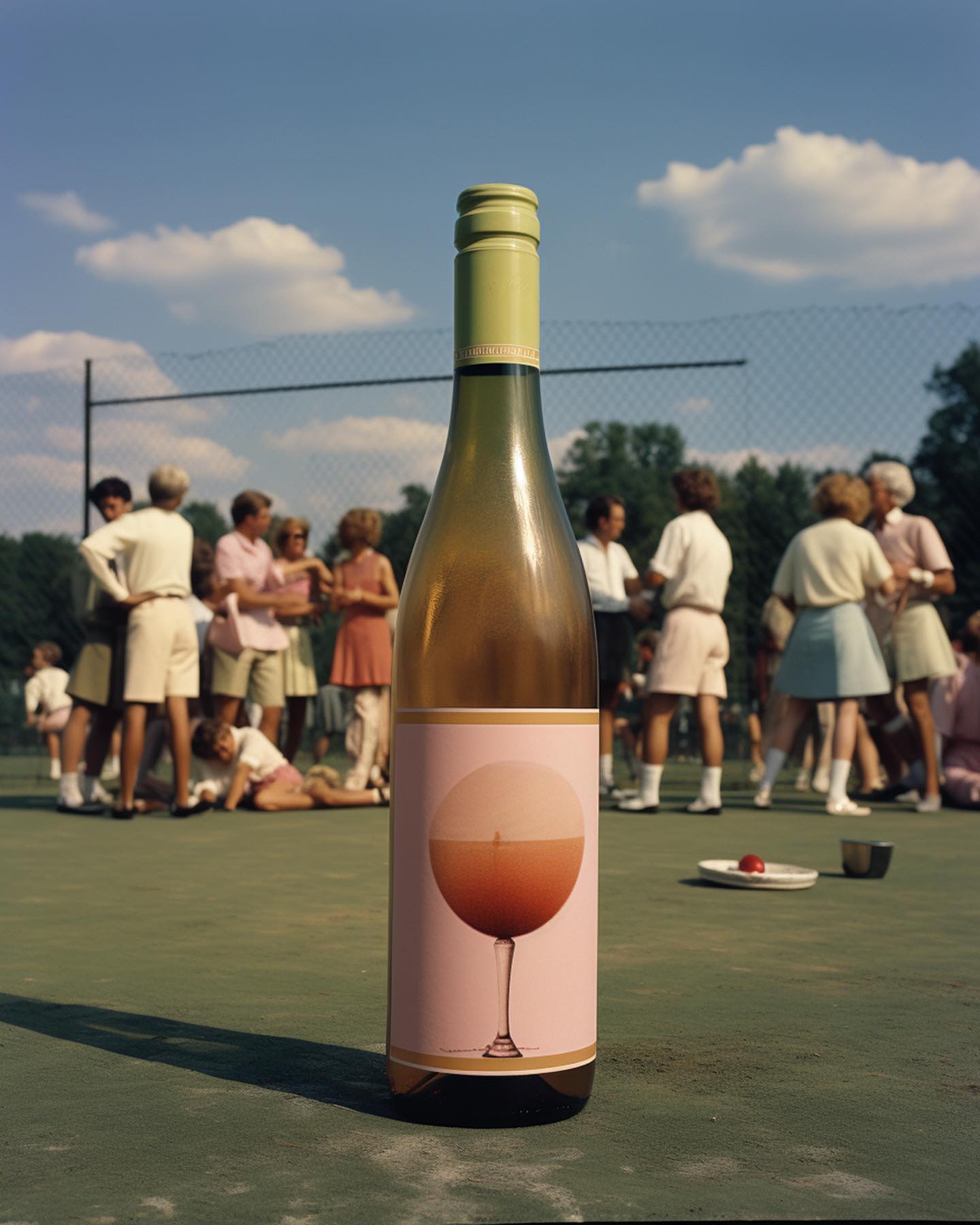 4. Tênis: Uma garrafa de vinho branco repousa sobre uma quadra de tênis. Ao fundo, jogadores socializam, mas o destaque é o rótulo da garrafa que mostra justamente uma taça de vinho.