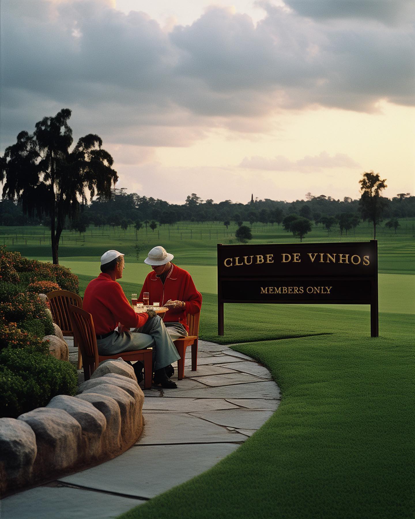 1. Entrada: Dois senhores vestidos com roupas de golfe vintage vermelhas sentados em uma mesa ao ar livre, com uma placa "CLUBE DE VINHOS - MEMBERS ONLY" e um campo de golfe ao fundo.