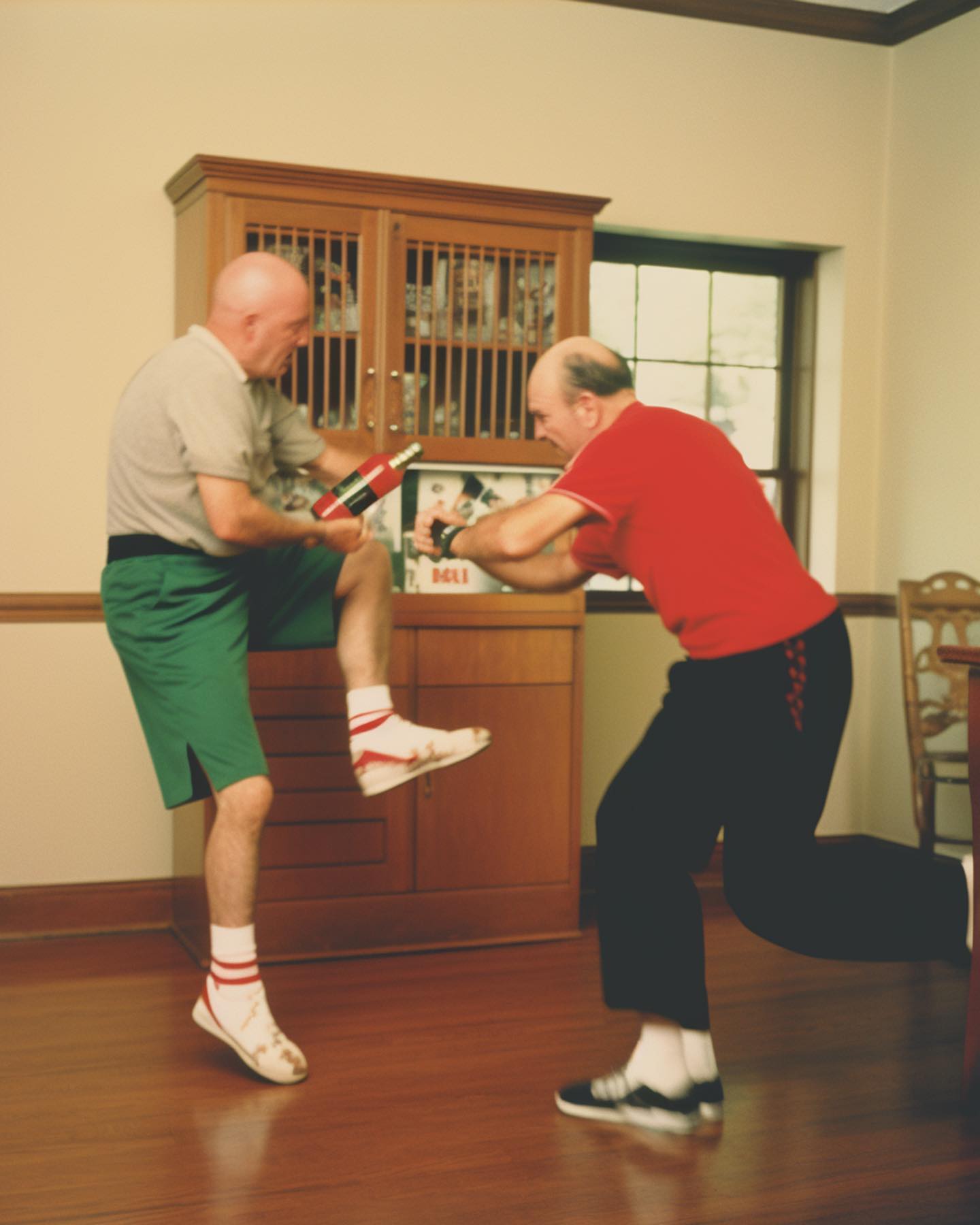 5. Briga: Dois senhores idosos "brigando" (em poses desajeitadas) dentro de uma sala com móveis de madeira, usando garrafas de vinho como armas.