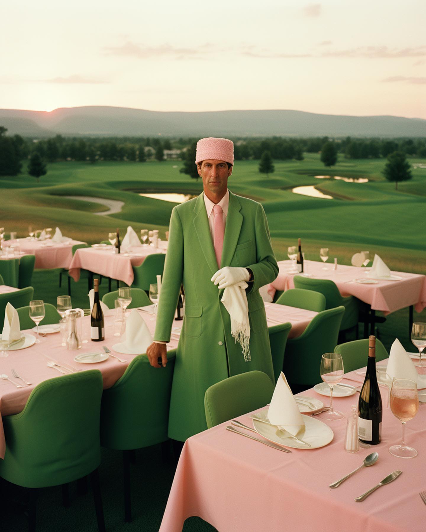 10. Jantar: Um garçom vestido com um terno verde e chapéu rosa, em um restaurante ao ar livre com mesas postas com toalhas rosa, em frente a um campo de golfe.