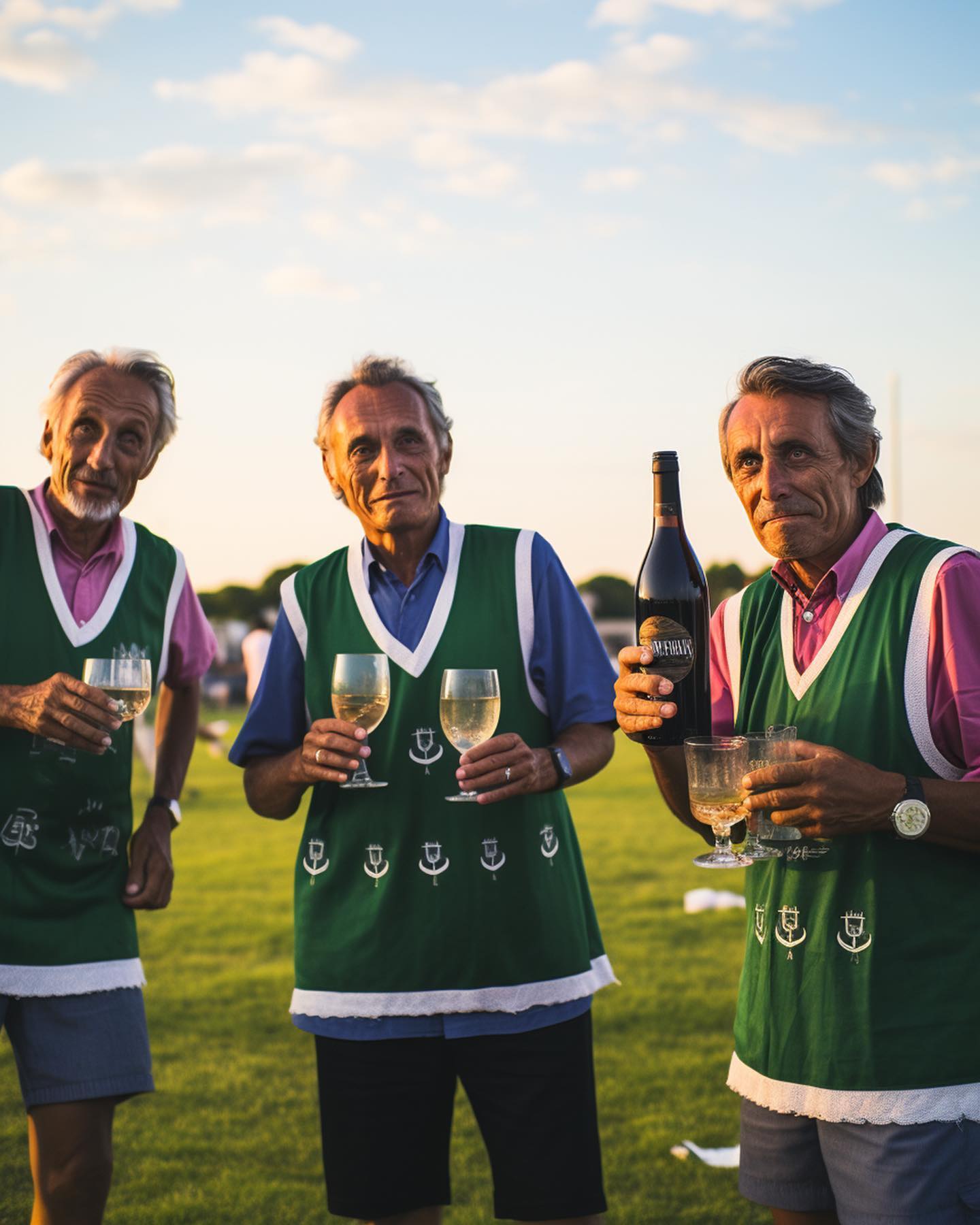 3. Uniforme: Três senhores idosos usando coletes verdes de golfe com taças bordadas, segurando taças e garrafas.