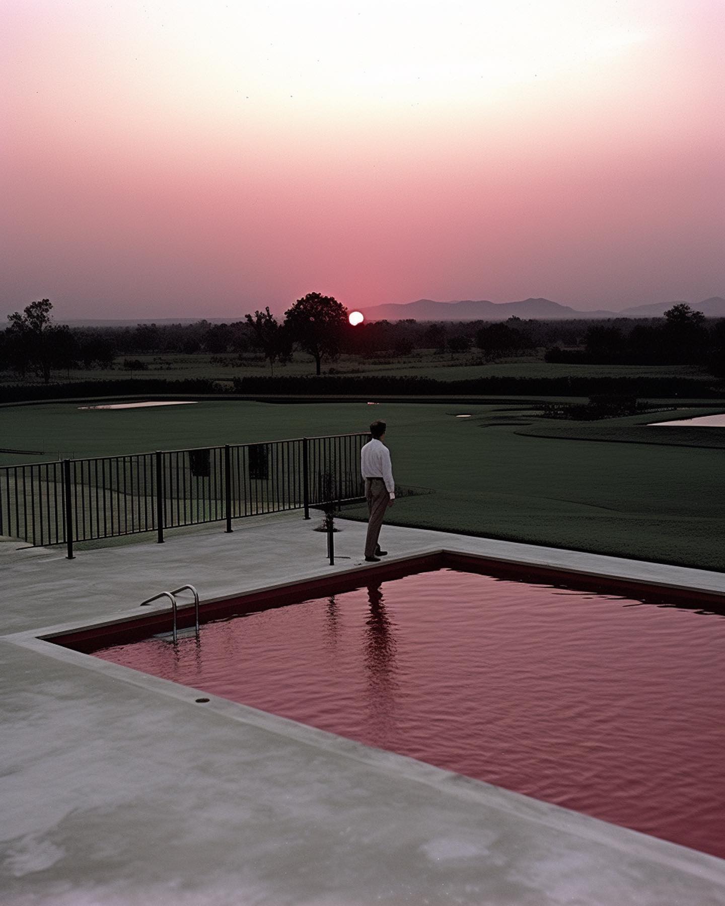 7. Piscina: Um homem observa o pôr do sol em uma piscina cuja água é vermelho-vinho, simulando um tanque de vinho.