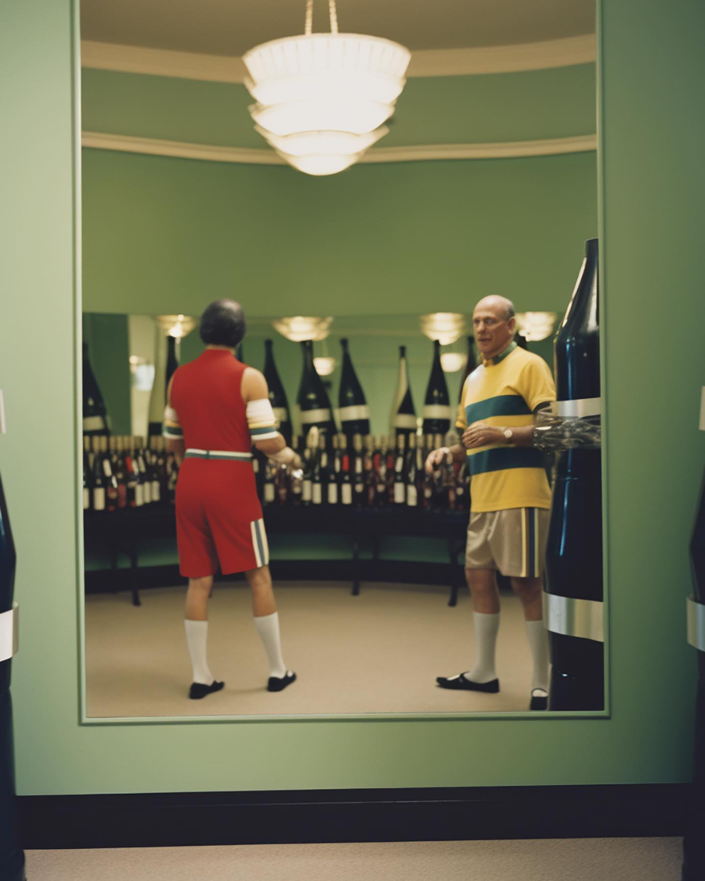 8. Vestiário: Dois homens em trajes de banho listrados vintage conversam em um vestiário verde com espelhos, onde se veem reflexos de garrafas gigantes.