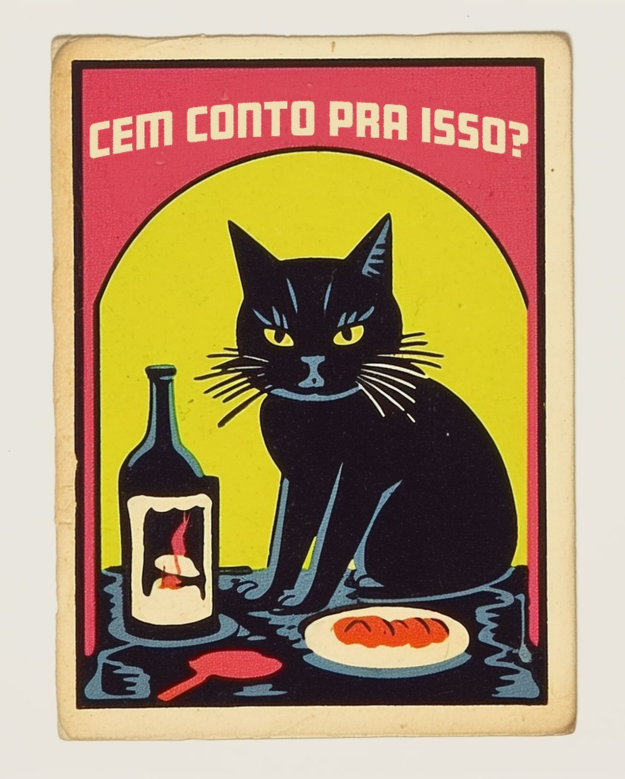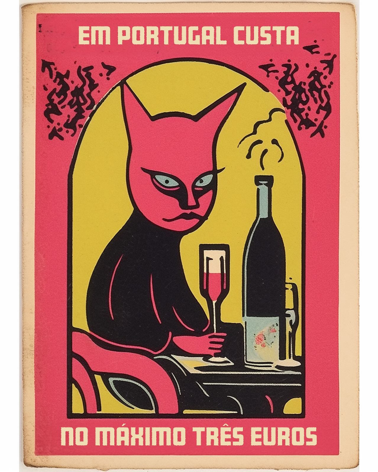 - "EM PORTUGAL CUSTA NO MÁXIMO TRÊS EUROS": Gato rosa olhando com desdém para uma garrafa. (Crítica ao preço inflacionado de vinhos portugueses no Brasil).