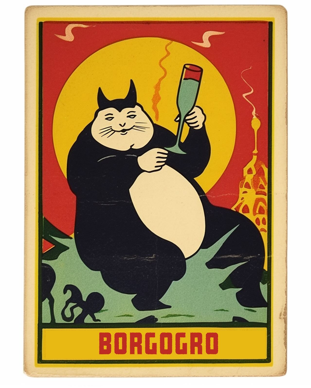 - "BORGOGRO": Gato preto gordo (estilo Totoro/Snorlax) bebendo. Trocadilho com Borgogno (produtor de Barolo) e Ogro (pessoa rústica ou que come/bebe muito).