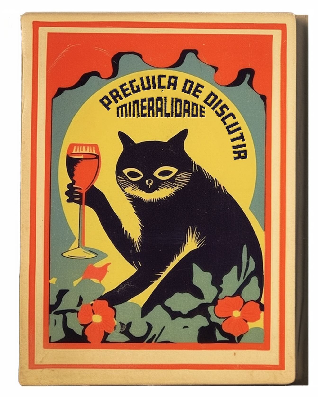 - "PREGUIÇA DE DISCUTIR MINERALIDADE": Gato preto segurando uma taça, parecendo entediado. (Sátira às discussões intermináveis e técnicas sobre o termo "mineralidade").