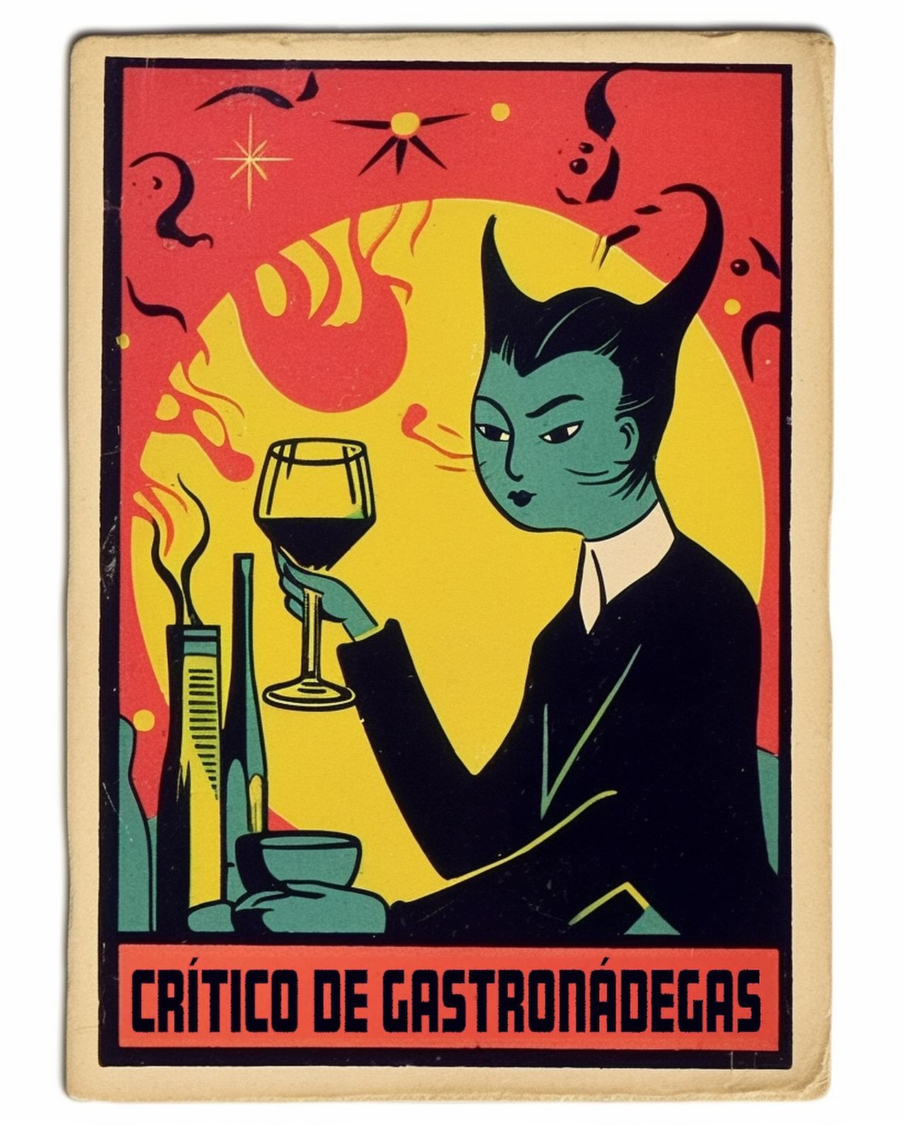 - "CRÍTICO DE GASTRONÁDEGAS": Figura diabólica/felina verde segurando uma taça. (Crítica a influenciadores gastronômicos ruins ou "bundões").