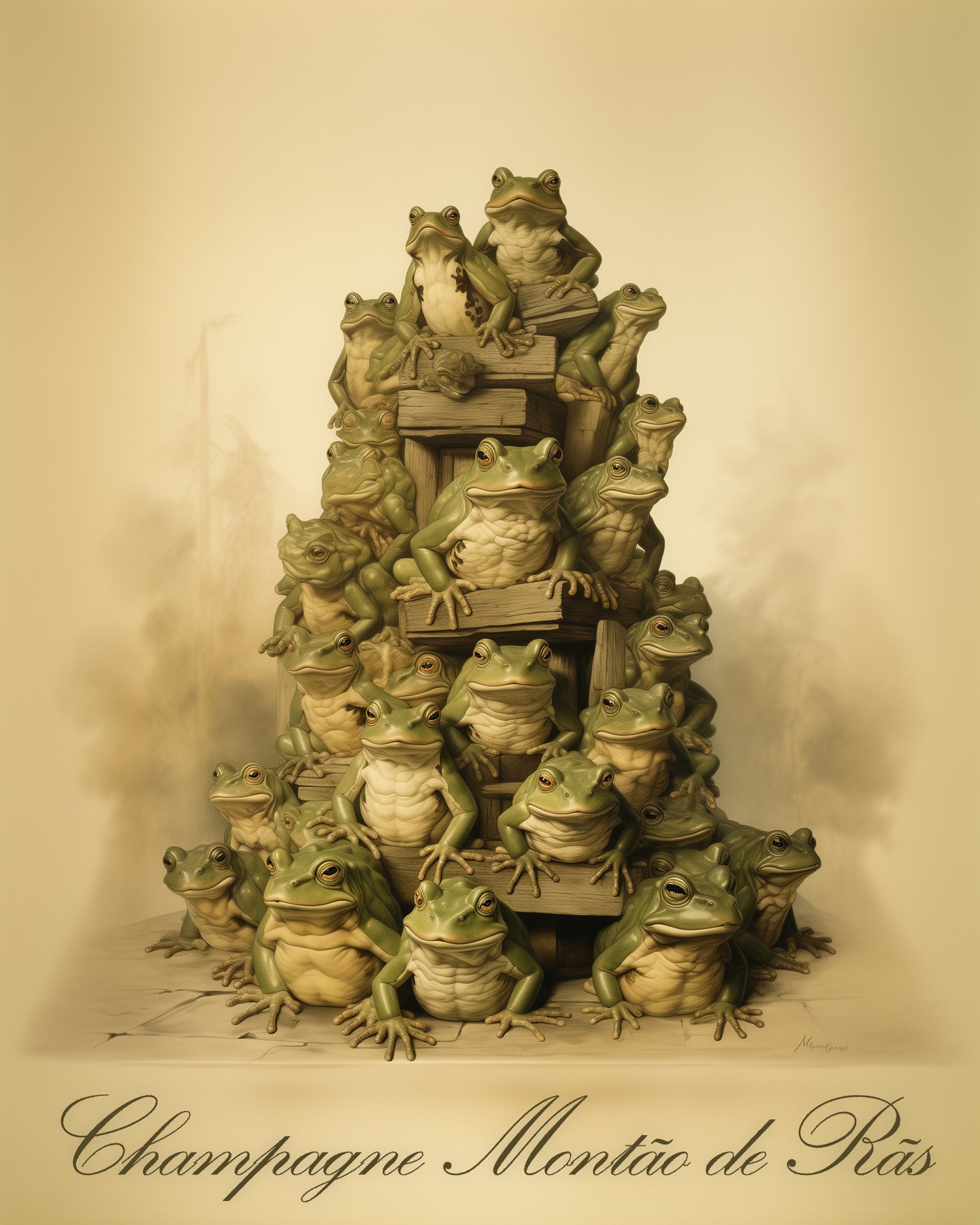 A imagem mostra uma ilustração realista de uma pilha (um montão) de sapos/rãs verdes empoleirados uns sobre os outros. Abaixo, em fonte elegante cursiva dourada (imitando o rótulo de Champagne), está escrito: "Champagne Montão de Rãs".