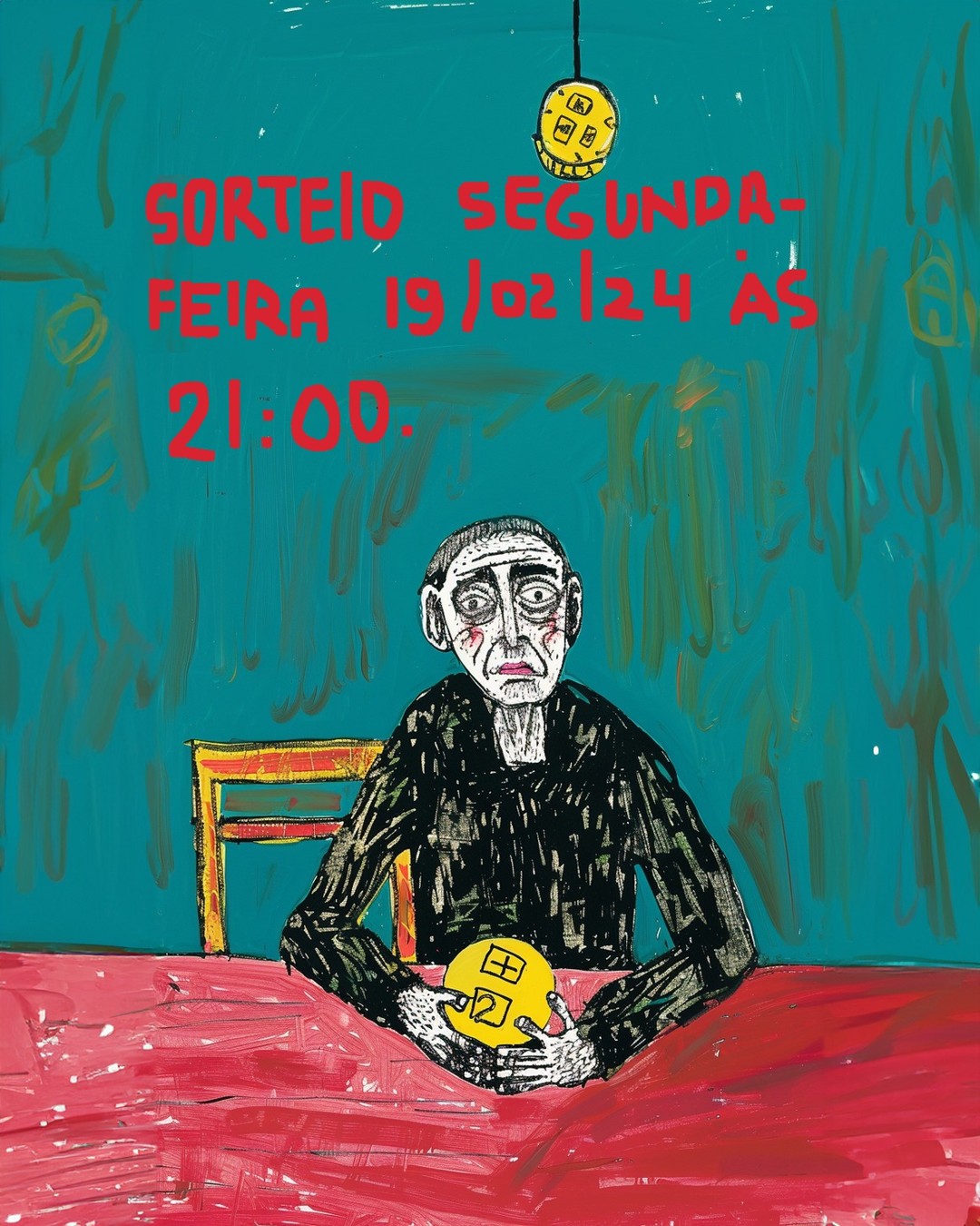 4. Slide 4: Homem idoso segurando uma esfera/orbe dourada com símbolos. Texto: "SORTEIO SEGUNDA-FEIRA 19/02/24 ÀS 21:00.".