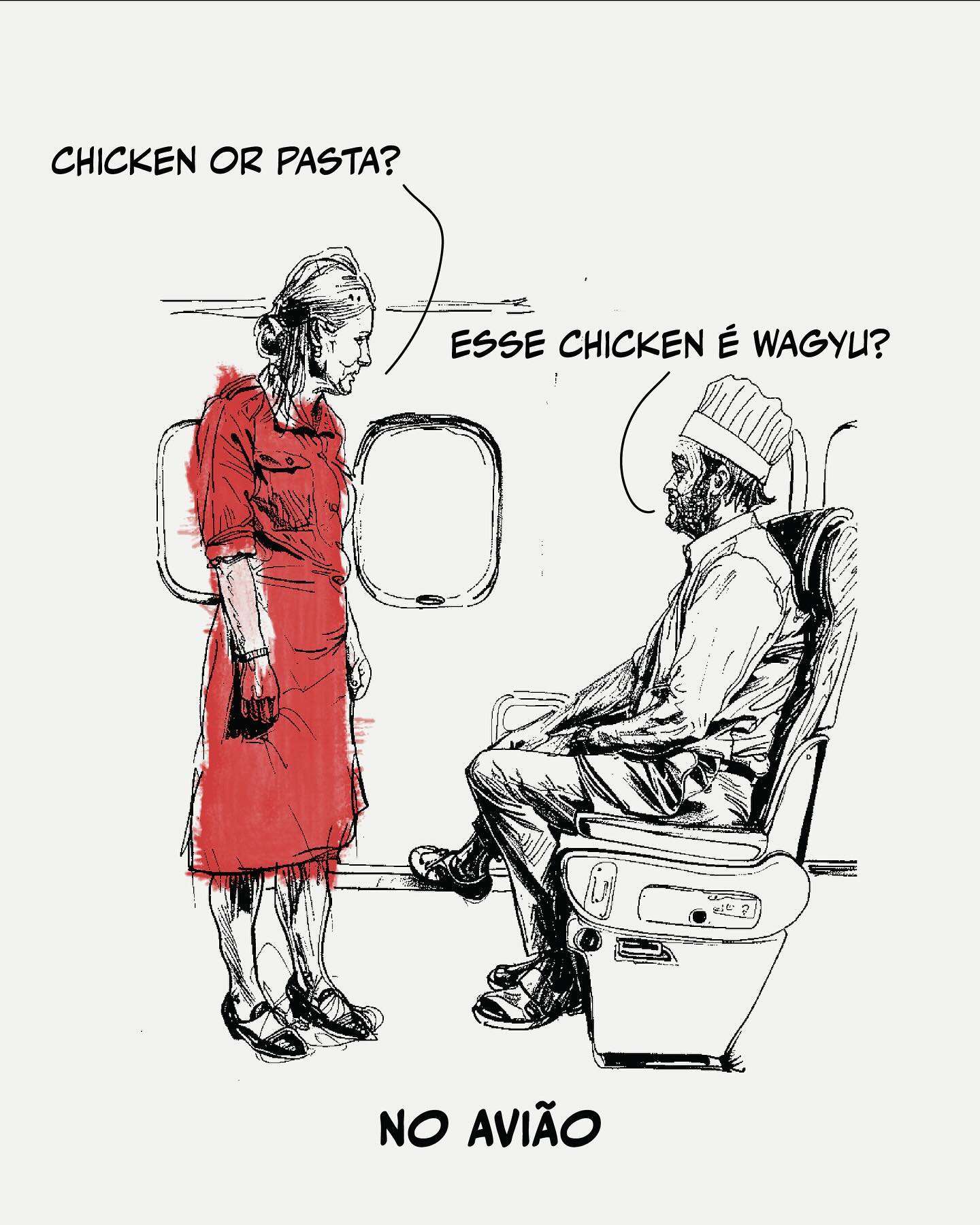 2. No Avião: Chef perguntando à comissária: "Chicken or Pasta? Esse chicken é Wagyu?".