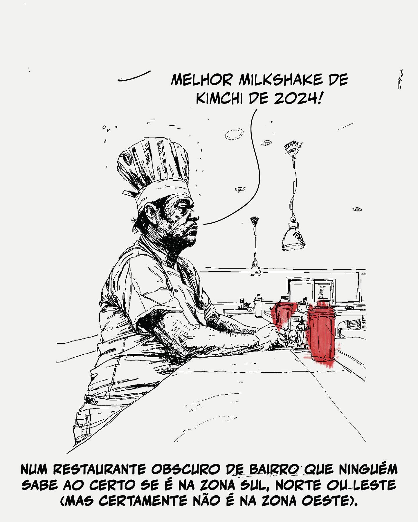 4. Num Restaurante Obscuro de Bairro: Chef elogiando um milkshake bizarro: "Melhor Milkshake de Kimchi de 2024!". Legenda: (Num restaurante obscuro de bairro que ninguém sabe ao certo se é na zona sul, norte ou leste (mas certamente não é na zona oeste)).