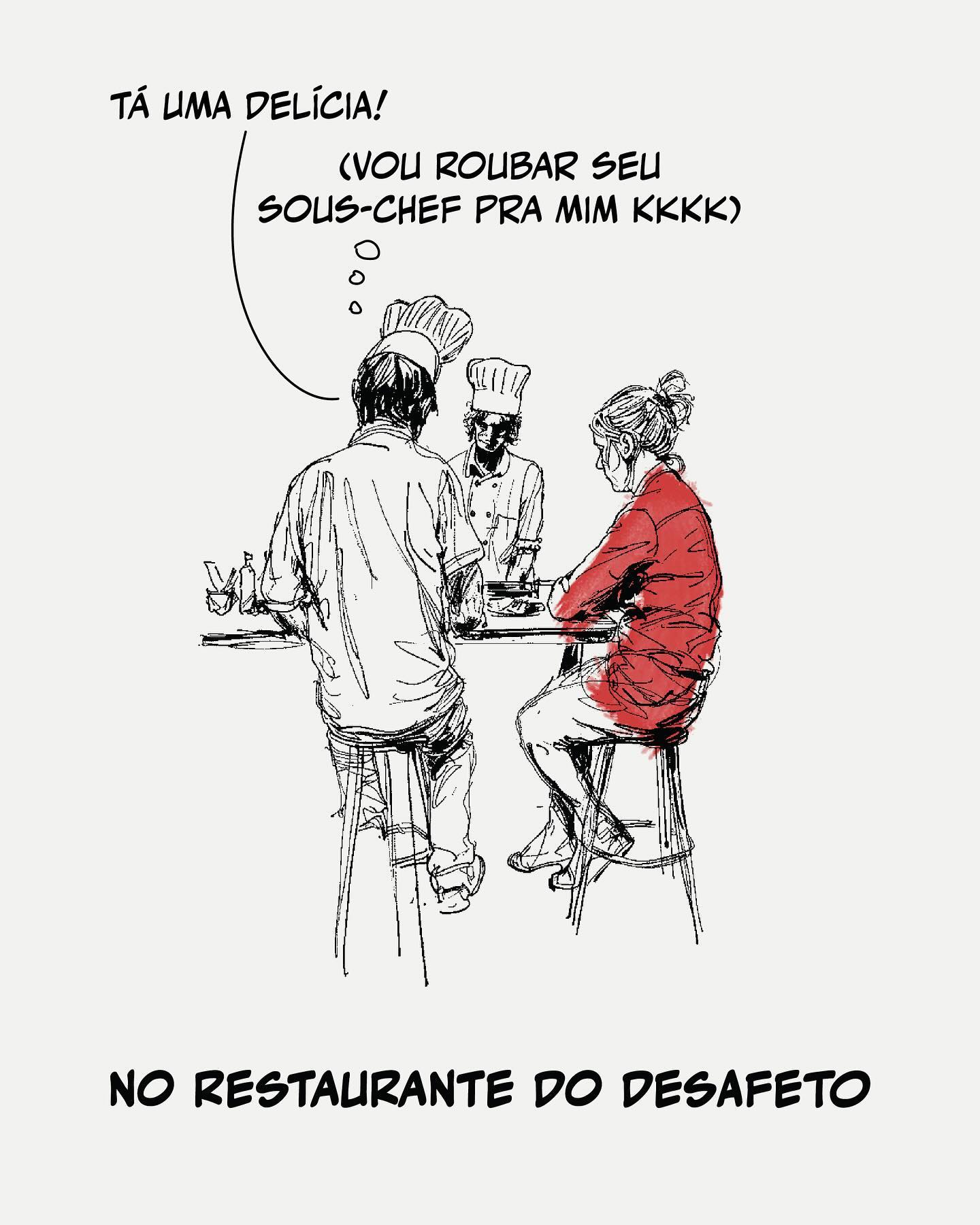 7. No Restaurante do Desafeto: Falando alto para o colega: "Tá uma delícia!". Pensamento real: (Vou roubar seu sous-chef pra mim kkkk).