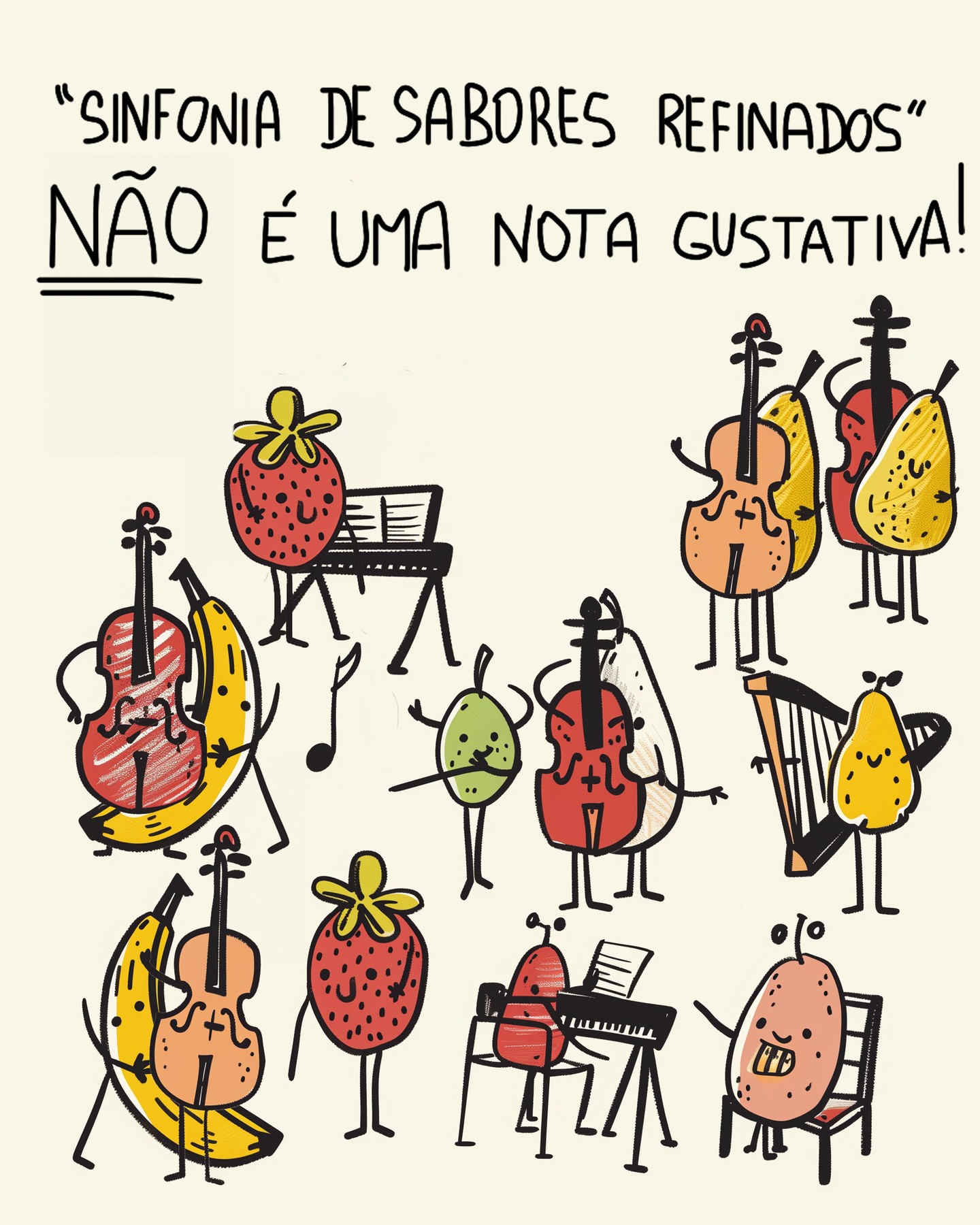 A ilustração mostra várias frutas (morango, banana, pera, limão) com braços e pernas, tocando instrumentos musicais (violoncelo, piano, harpa). Texto no topo: "SINFONIA DE SABORES REFINADOS" "NÃO É UMA NOTA GUSTATIVA!"
