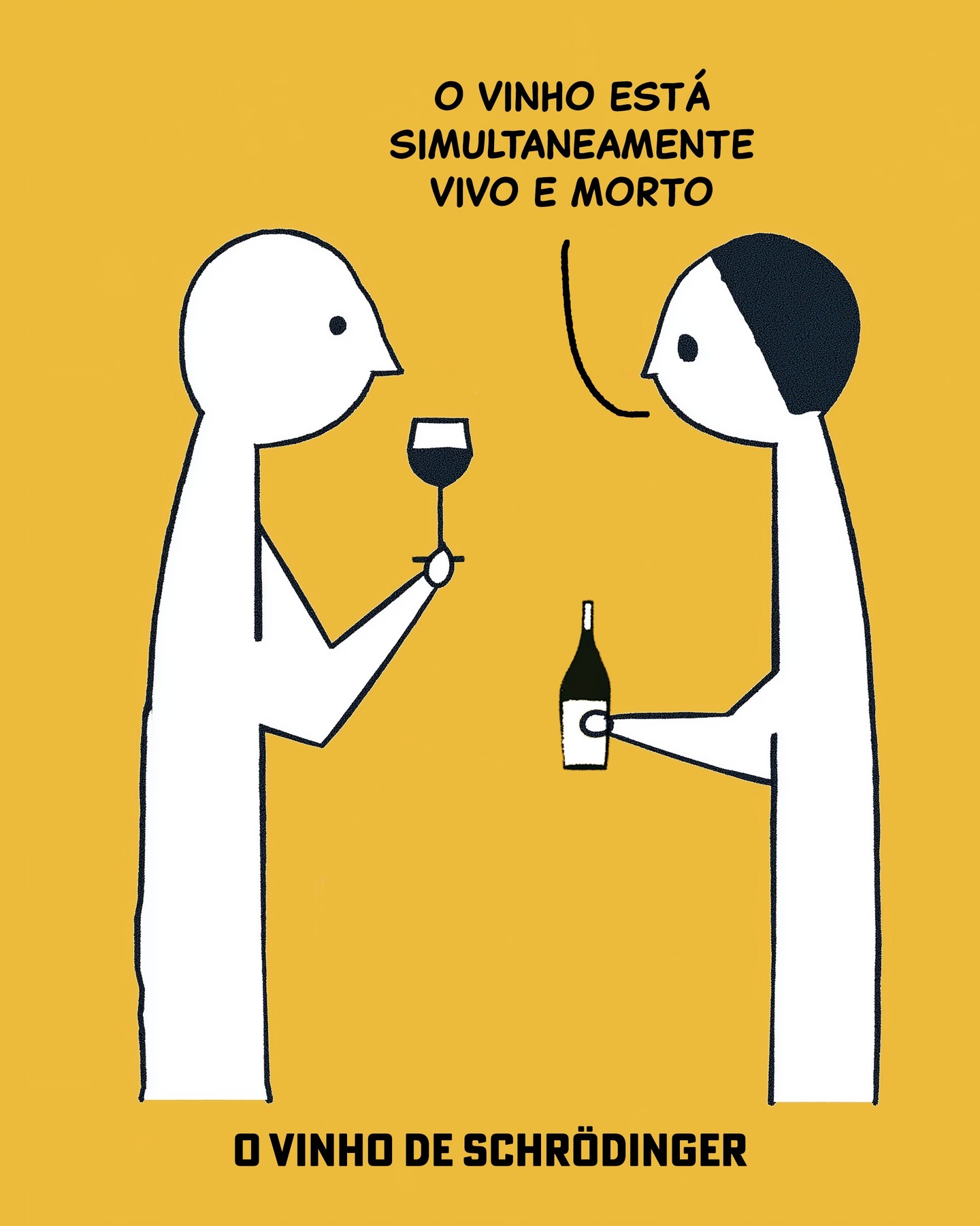 Dois personagens simplificados conversam. Um segura uma garrafa e diz: "O VINHO ESTÁ SIMULTANEAMENTE VIVO E MORTO". Título abaixo: "O VINHO DE SCHRÖDINGER".