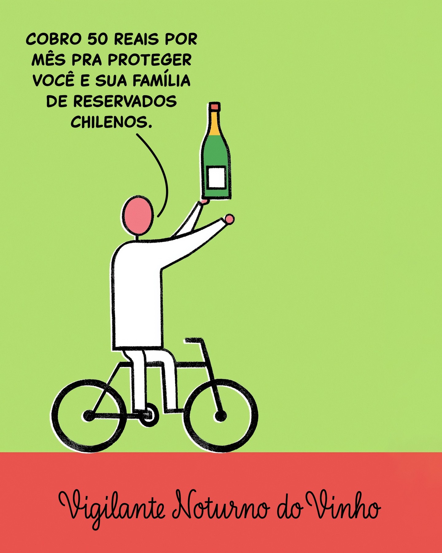 5. Vigilante Noturno do Vinho: Um homem de bicicleta erguendo uma garrafa como se fosse uma lanterna. Texto: "Cobro 50 reais por mês pra proteger você e sua família de Reservados Chilenos."