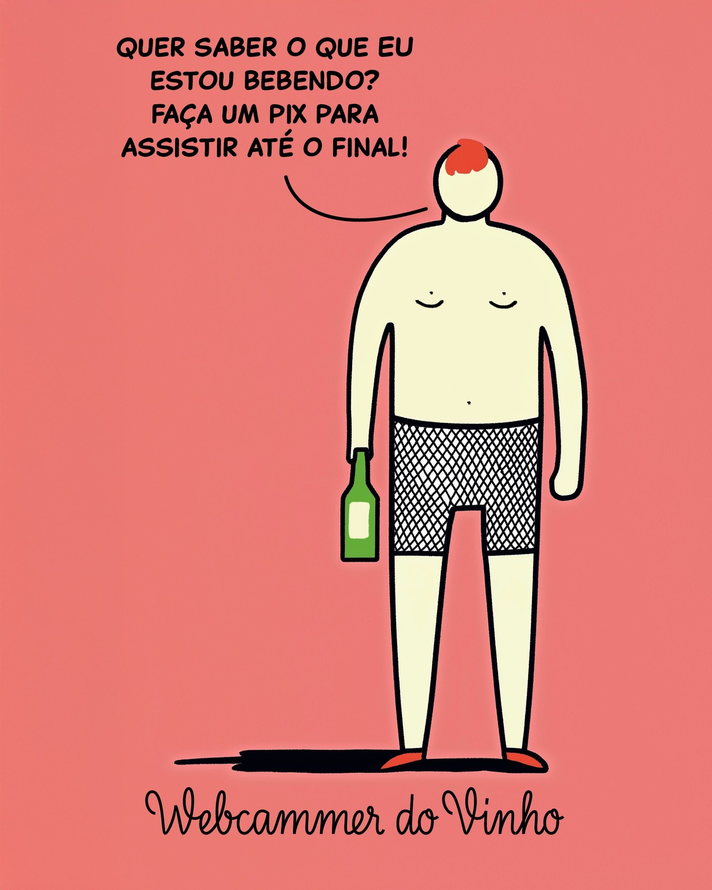 4. Webcammer do Vinho: Um homem de cueca segurando uma garrafa. Texto: "Quer saber o que eu estou bebendo? Faça um pix para assistir até o final!" (Sátira à monetização de conteúdo adulto/OnlyFans aplicada ao vinho).