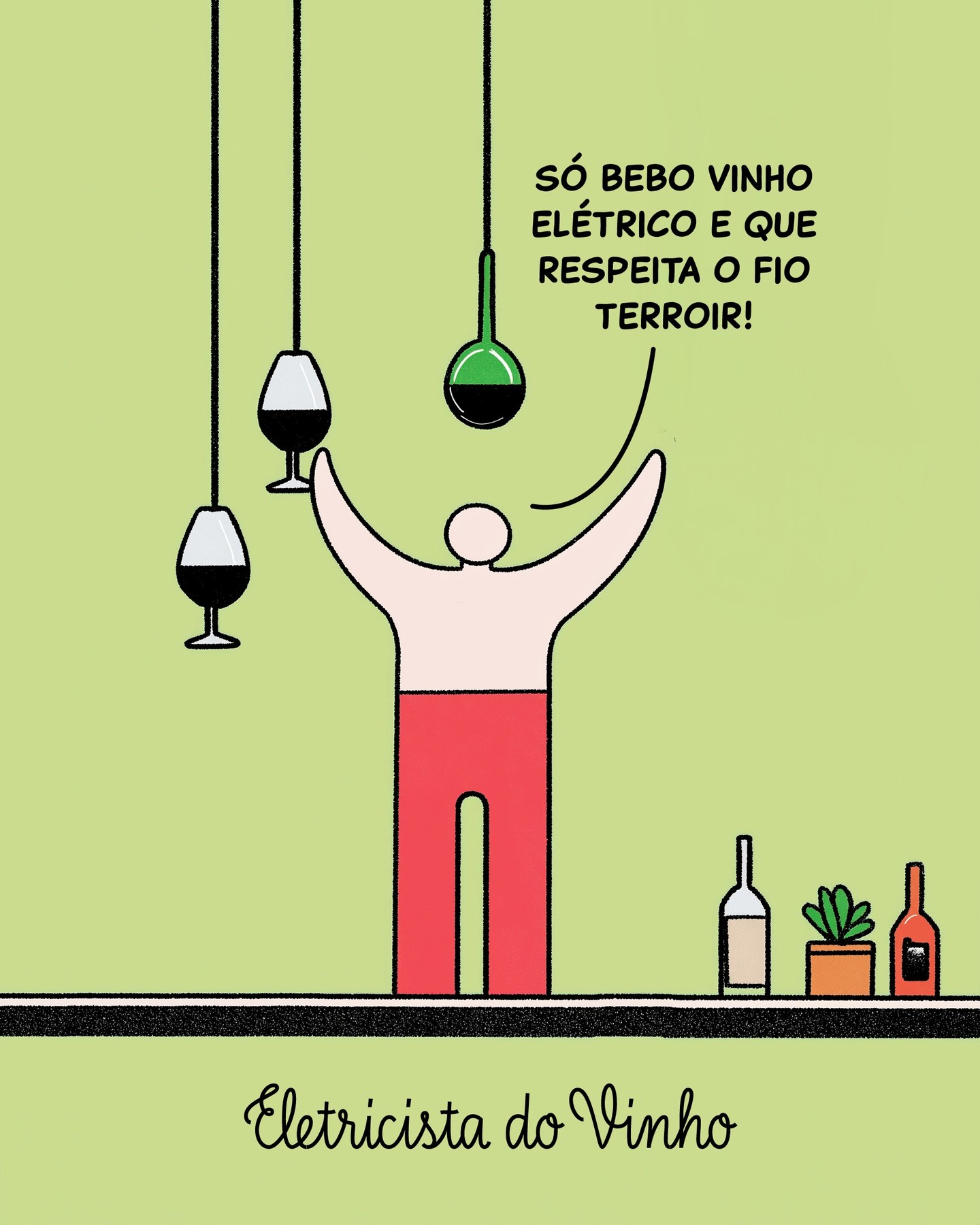 3. Eletricista do Vinho: Um homem exalta lâmpadas em formato de taça e garrafa. Texto: "Só bebo vinho elétrico e que respeita o fio terroir!" (Sátira aos termos "vinho elétrico" e "fio condutor").