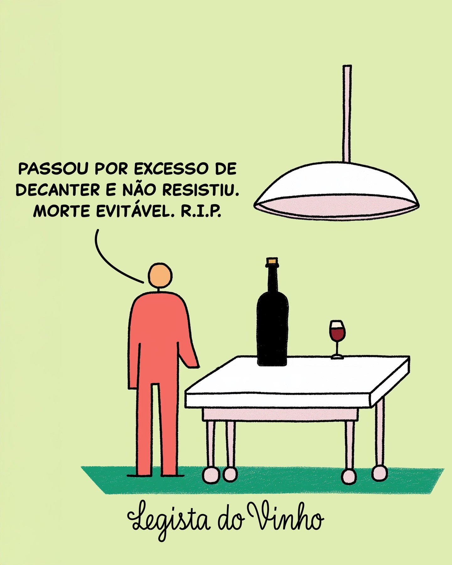 2. Legista do Vinho: Um homem observa uma garrafa "falecida" numa mesa de autópsia. Texto: "Passou por excesso de decanter e não resistiu. Morte evitável. R.I.P."