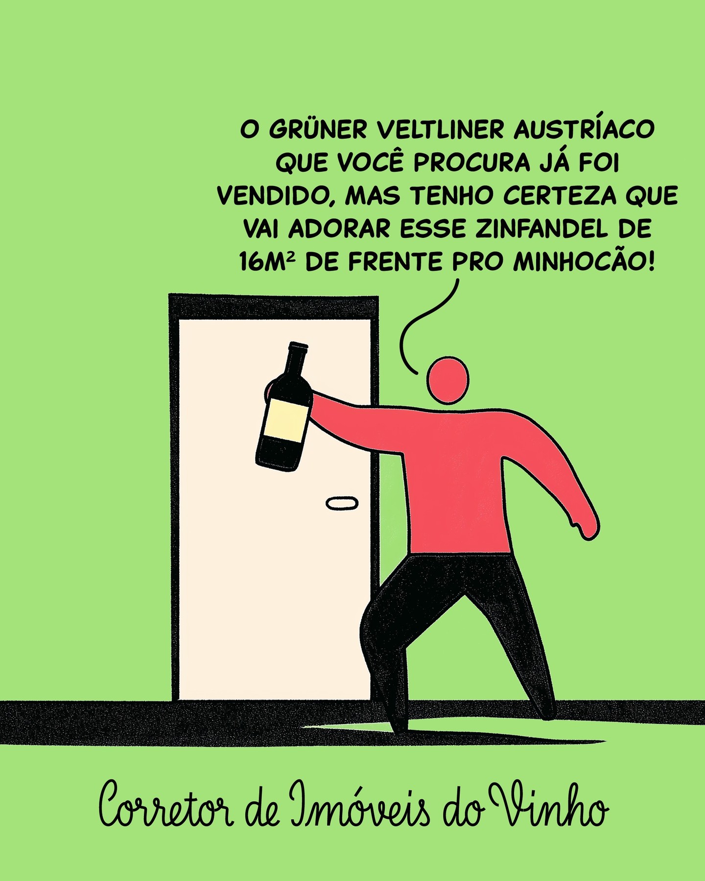 6. Corretor de Imóveis do Vinho: Um vendedor tentando empurrar um produto inferior. Texto: "O Grüner Veltliner austríaco que você procura já foi vendido, mas tenho certeza que vai adorar esse Zinfandel de 16m2 de frente pro Minhocão!" (Misturando jargão imobiliário de SP com vinho).