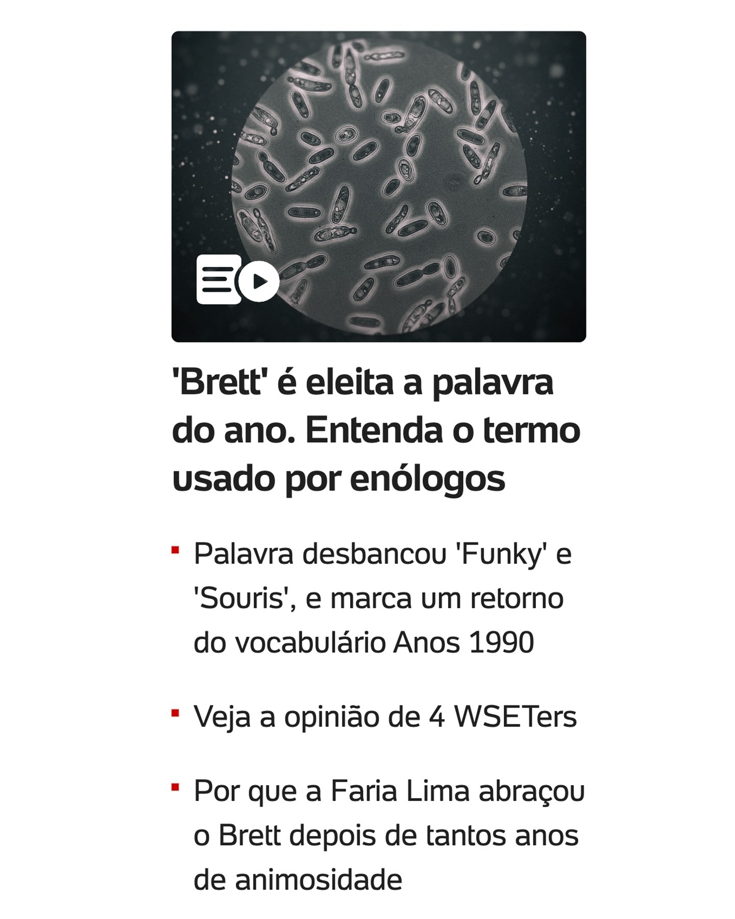 Texto principal: "'Brett' é eleita a palavra do ano. Entenda o termo usado por enólogos"
