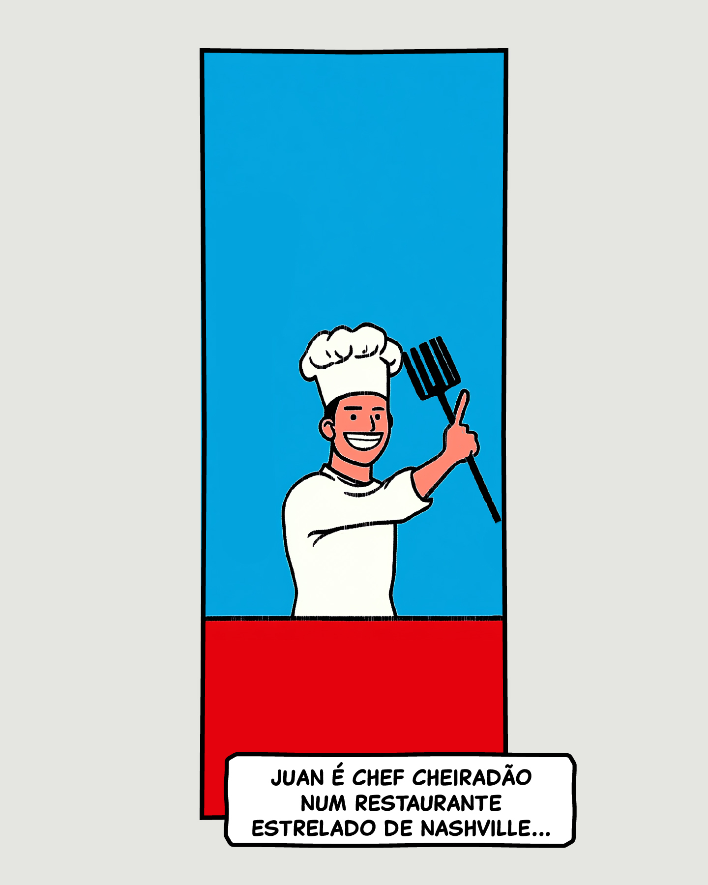 1. Juan: Chef sorridente segurando um garfo gigante. Texto: "JUAN É CHEF CHEIRADÃO NUM RESTAURANTE ESTRELADO DE NASHVILLE..."